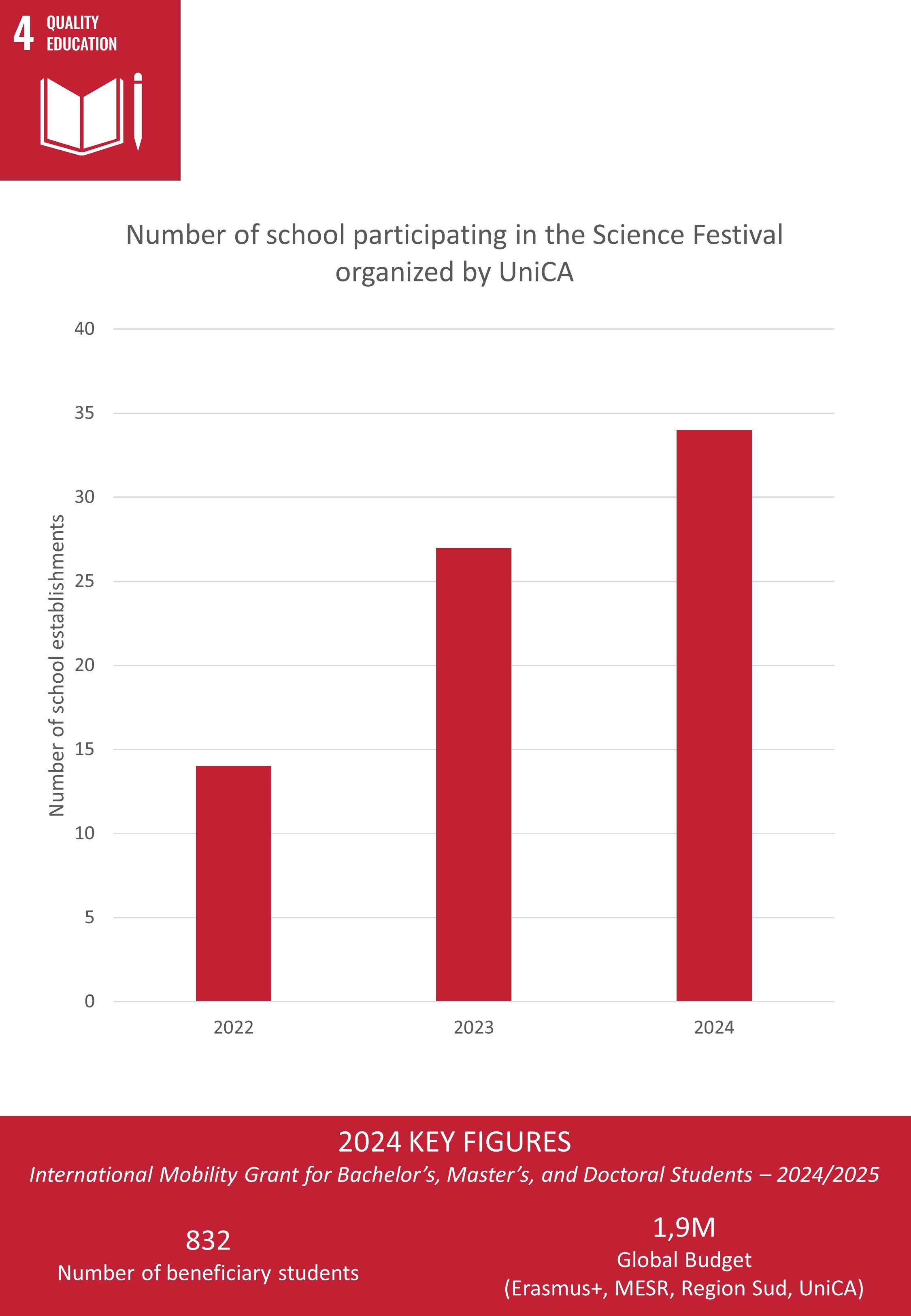 UniCA Junior Jedi program , targeting middle schools in priority areas, have been signed with four local schools. This program brings together between 40 and 60 middle school students, engaging them in a variety of activities (on Wednesdays and in school holidays) such as laboratory experiments, meetings with university students, campus visits and interactions with researchers. The aim is to proactively prepare them and give them opportunities to become familiar with higher education and ultimately to enroll.