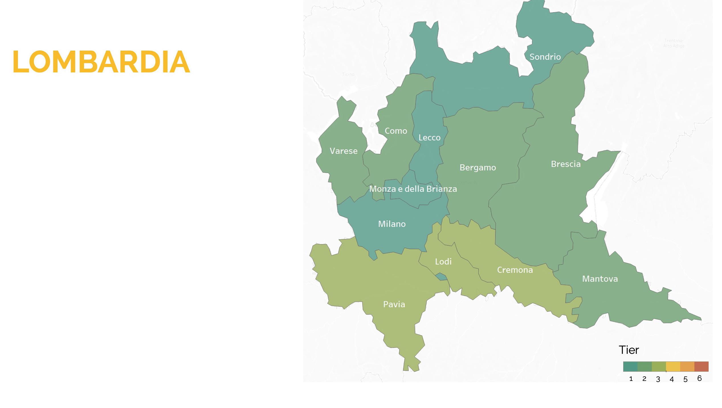 Nel panorama globale, l’Italia si posiziona con un punteggio elevato (85.33), all’interno del Tier 2 sui 6 identificati, e al 22° posto nella comparazione europea, La Lombardia, con un punteggio di 59.6, si posiziona al 191° posto tra tutte le regioni europee, nel Tier 6 nei 9 presenti (Figura 4). Come previsto, i risultati ottenuti a livello provinciale italiano sono simili a quelli del progetto europeo per la maggiore omogeneità dei territori rispetto a quanto avviene con la comparazione su scala globale.