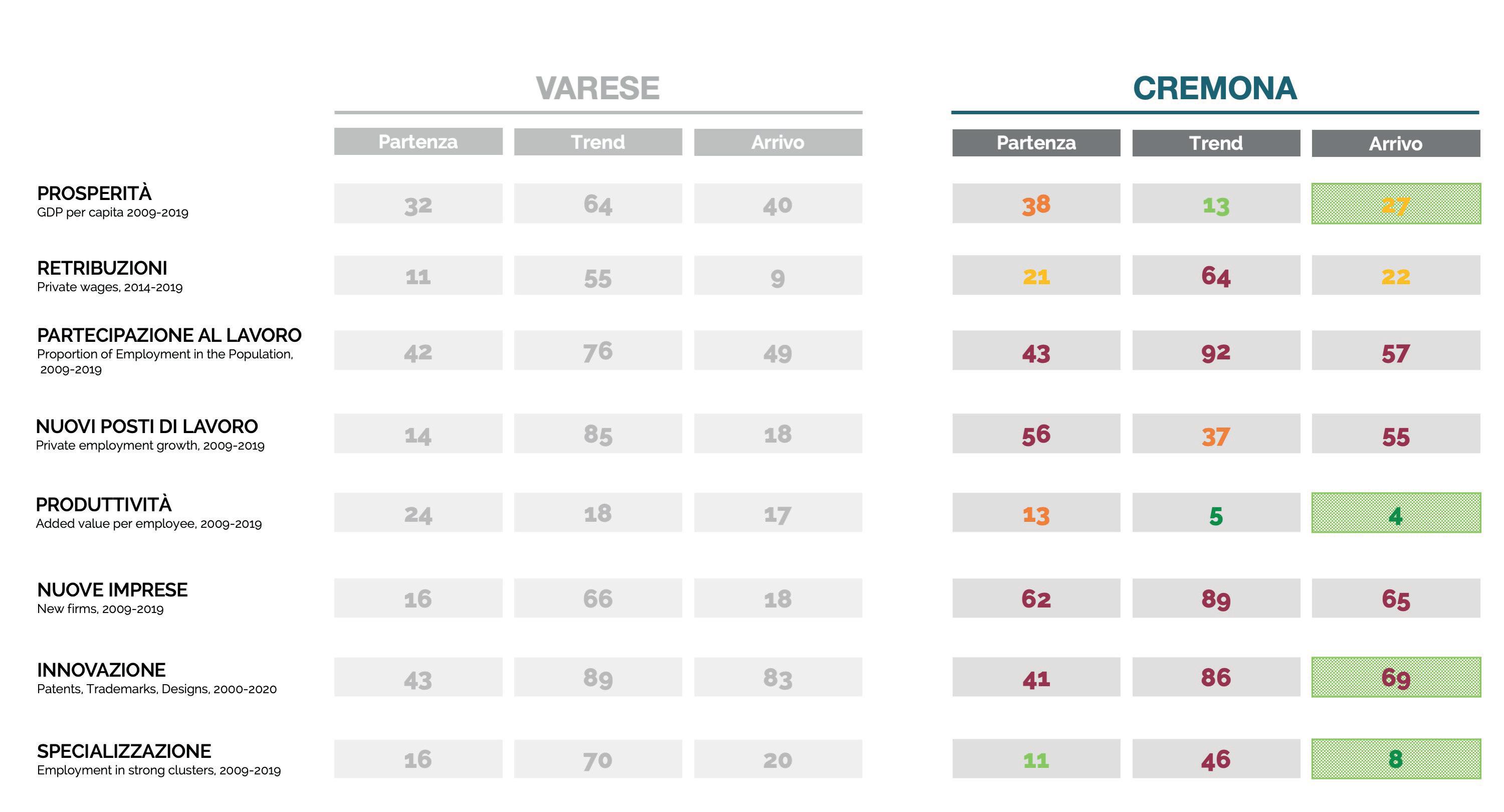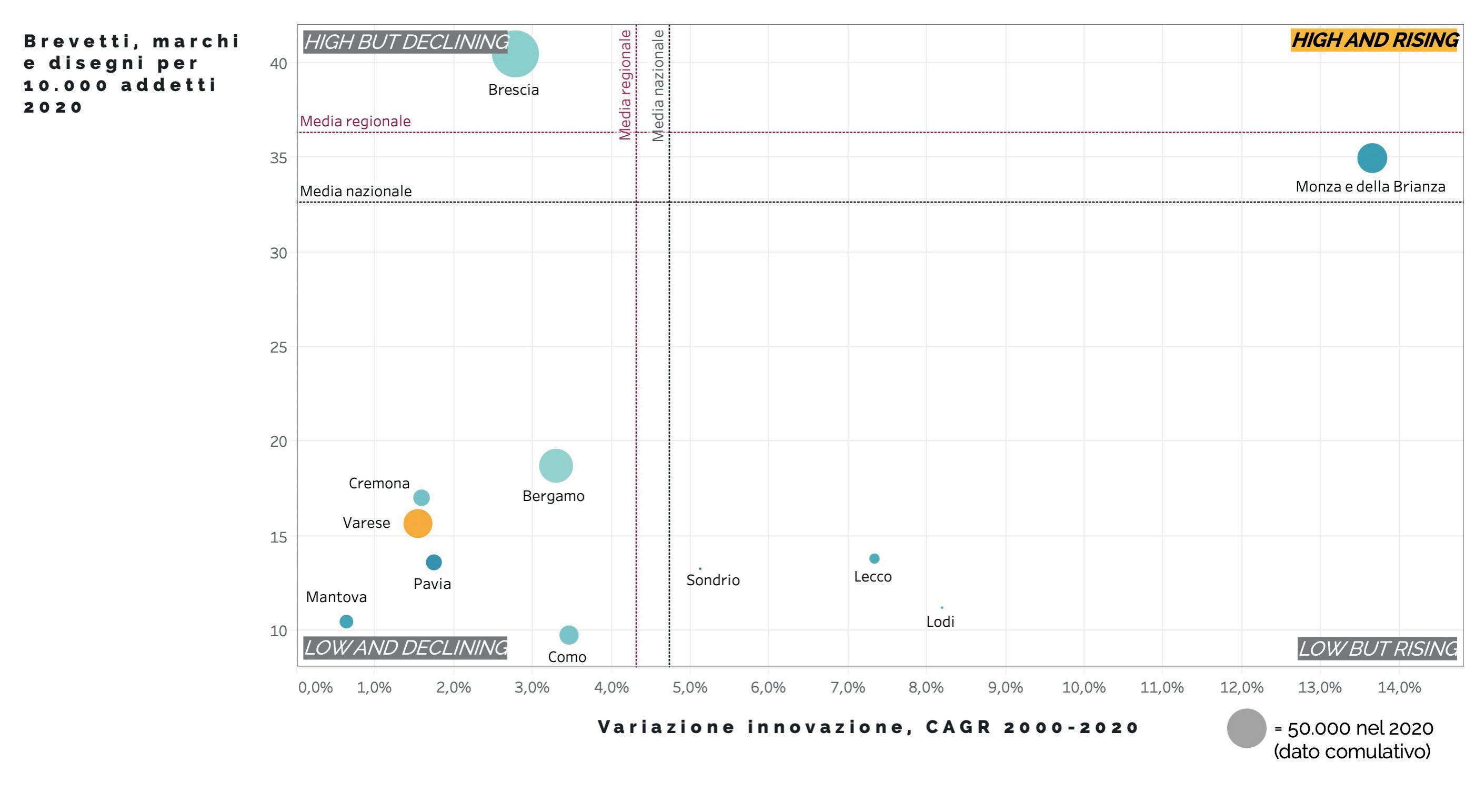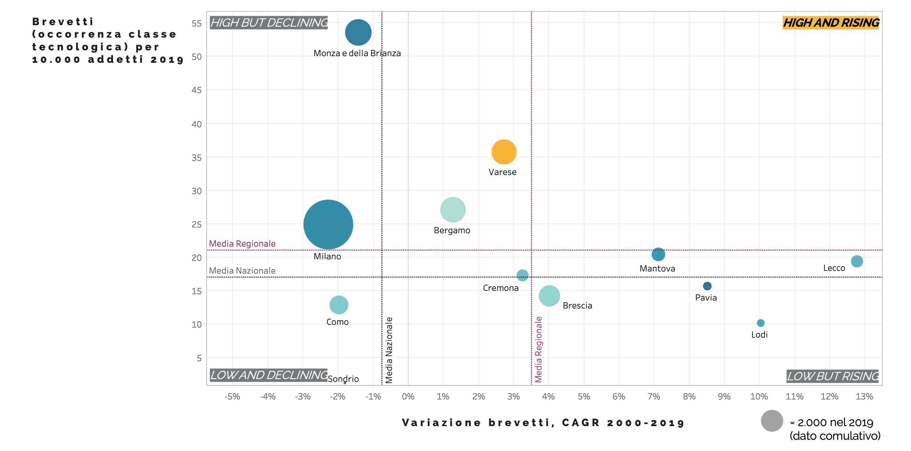 al legno. Un multi-distretto, come è stato definito in passato, che nel tempo ha saputo trasformare e irrobustire alcune di queste specializzazioni e farne emergere altre, allargando a servizi ad alto valore aggiunto, logistica e trasporti, oltre che a cluster emergenti, come si è mostrato nelle analisi. Un sistema imprenditoriale denso, costituito nella quasi totalità (94%) da piccole imprese (con meno di 10 addetti), ma che registra anche la presenza di importanti multinazionali come Leonardo, Whirlpool Emea, Lindt & Sprüngli, Sanofi Aventis, Carl Zeiss, Legrand, Vodafone, Tenova, Kone, Carlsberg per menzionarne alcune, oltre che di medio-grandi imprese con brand noti, come Yamamay, Missoni, Paul&Shark, Alfredo Grassi, Eolo, Prealpi, Elmec, ecc. Una provincia con una forte apertura internazionale e una elevata propensione all’export. È altresì vero che, come mostrano le analisi, nell’ultimo decennio Varese ha perso di specializzazione soprattutto sui cluster forti, ha visto contrarsi la sua capacità di commercio con l’estero, ha registrato elementi di debolezza sul mercato del lavoro e soprattutto sulla prosperità che è andata erodendosi. Tuttavia, l’elemento centrale perché la dimensione industriale di Varese possa ripartire con slancio si ritrova nella sua bassa dinamicità imprenditoriale, ciò che è stato inquadrato metodologicamente come “Fermento imprenditoriale” che porta Varese ad avere elementi di debolezza profonda sul sistema di innovazione sia in termini di capacità brevettuale sia in termini di lancio e sviluppo di startup i cui numeri, se proporzionati all’economia del territorio, sono ancora estremamente contenuti.