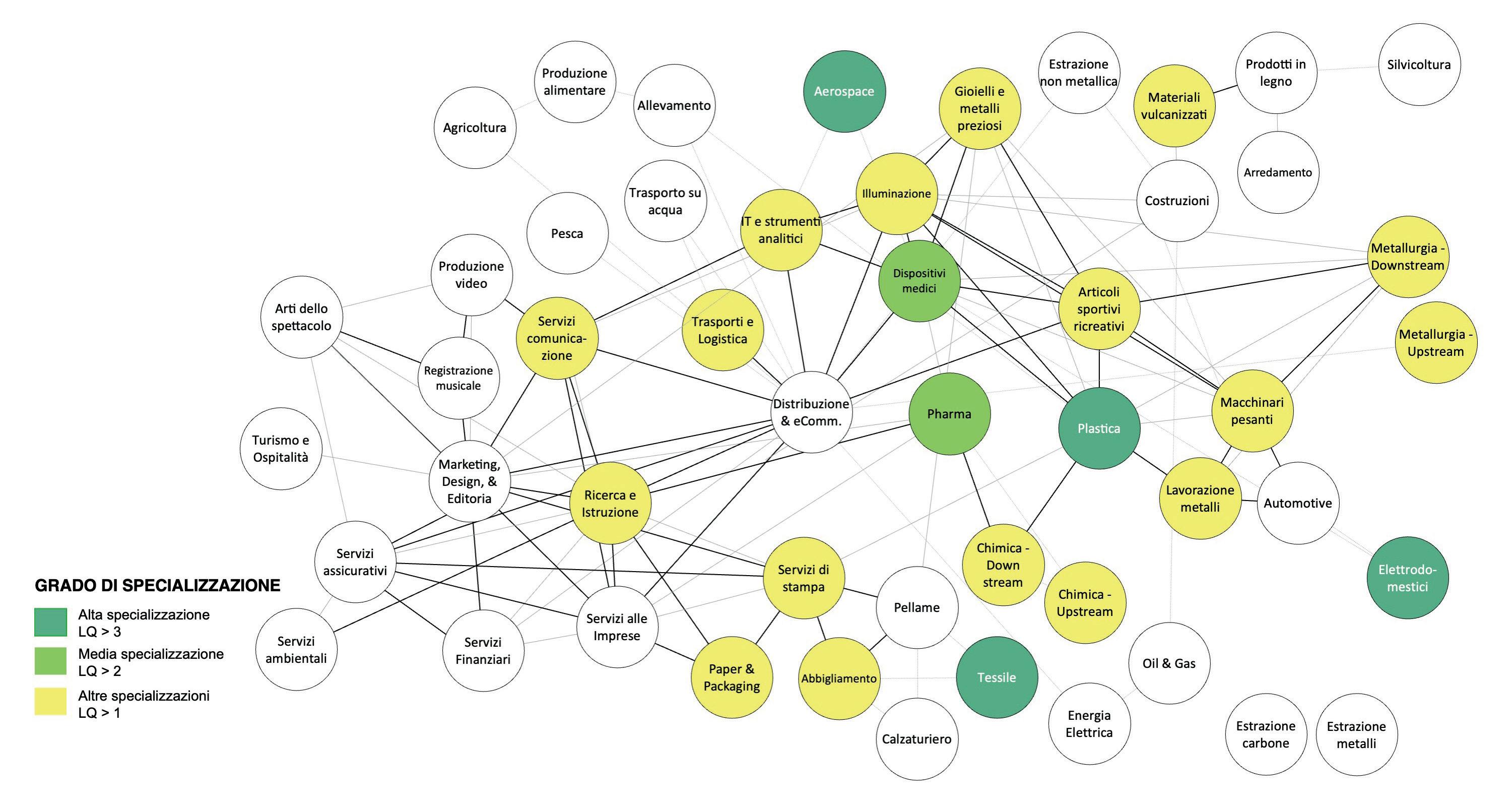 Per muoversi con forza verso questa direzione, dando concretezza e attuazione alla nuova identità del territorio, sarà poi necessario passare per la costruzione di un “cluster di cluster” che assommi in sé e valorizzi in modo coordinato e continuativo nel tempo specializzazioni forti con specializzazioni emergenti e promuova una progettualità diffusa, ma sotto una strategia di territorio comune. Ciò consentirà di favorire lo sviluppo di quella related variety che garantisce continua innovazione nei cluster e fermento imprenditoriale. A livello internazionale, è celebre il caso del Massachussetts Life Sciences Cluster di Boston,