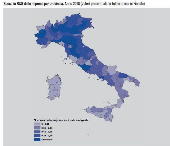se si calcola il numero degli addetti operanti in imprese manifatturiere ad alto contenuto tecnologico, che ci vede come quarta provincia in senso assoluto in Italia dopo Milano, Roma, Torino e appena sopra MonzaBrianza. E la nostra provincia è anche posizionata nel quintile più elevato in termini di spesa in attività di ricerca e sviluppo intra-muros (ossia svolte dalle imprese con proprio personale e proprie attrezzature) in percentuale del totale nazionale (come mostra la cartina dell’Italia proposta in queste pagine).