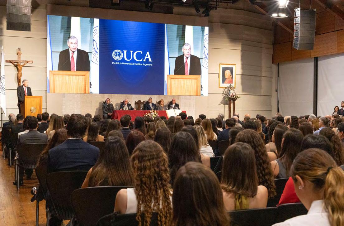 Al principio de la ceremonia, el Pbro. Gustavo Boquin, vicerrector de Formación Integral, bendijo los diplomas y reflexionó sobre el éxito, aquel que deja una huella positiva a su alrededor, el que construye el bien común. Esa es la misión que, como profesionales egresados de la UCA, se busca llevar en manos, corazón y mente, ser servidores del bien común y vivir hacia los demás, expresó.
