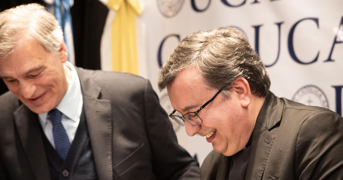 el dr. schiavone y el pbro. fernández techera firmaron el convenio para la doble titulación en la carrera de abogacía uca-ucu