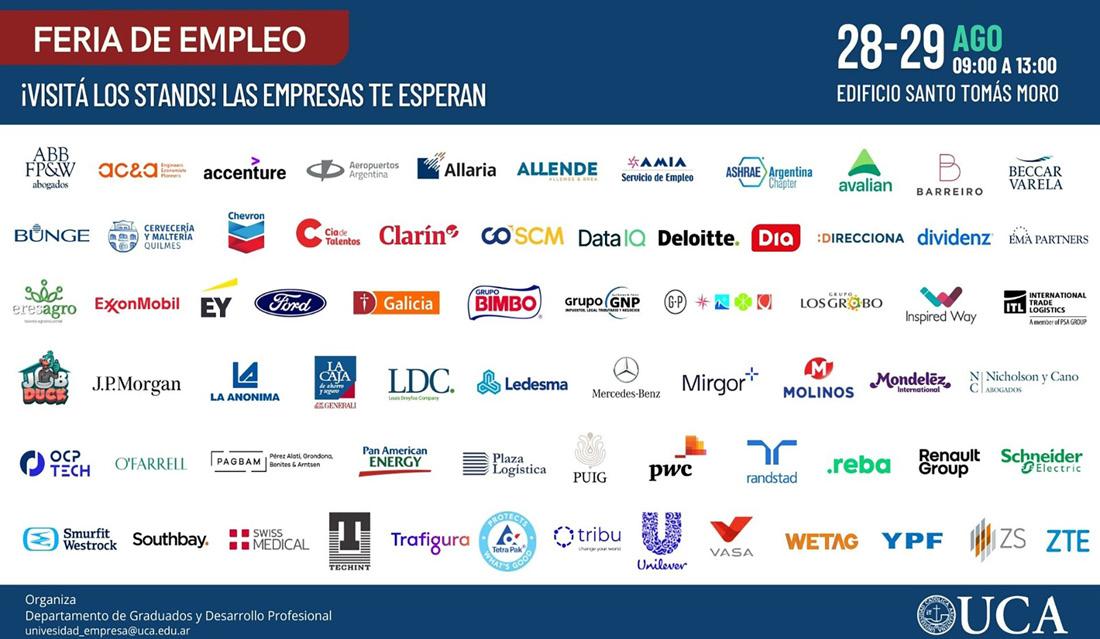 Se realizó la 22º edición de Feria de Empleo Universidad Empresa el 28 y 29 de agosto , en UCA Sede Buenos Aires , donde 70 empresas y organismos se reunieron con los estudiantes y graduados de la Universidad. El encuentro Universidad Empresa tendrá también lugar en la Sede Paraná el 11 de septiembre , en la Sede Rosario el 25 de septiembre , y finalmente en la Sede Mendoza el 2 de octubre .
