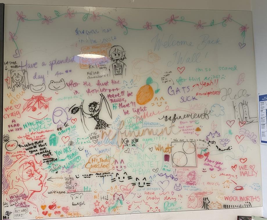 Mr Wally resides in a small room within our music precinct. Inside is a sleek piano, a desk scattered with trinkets and random sheets of paper, a whiteboard filled with hundreds of loving messages and quirky drawings from students, 2 wheely chairs and a few regular chairs to account for the masses of students who wish to dwell in his presence.