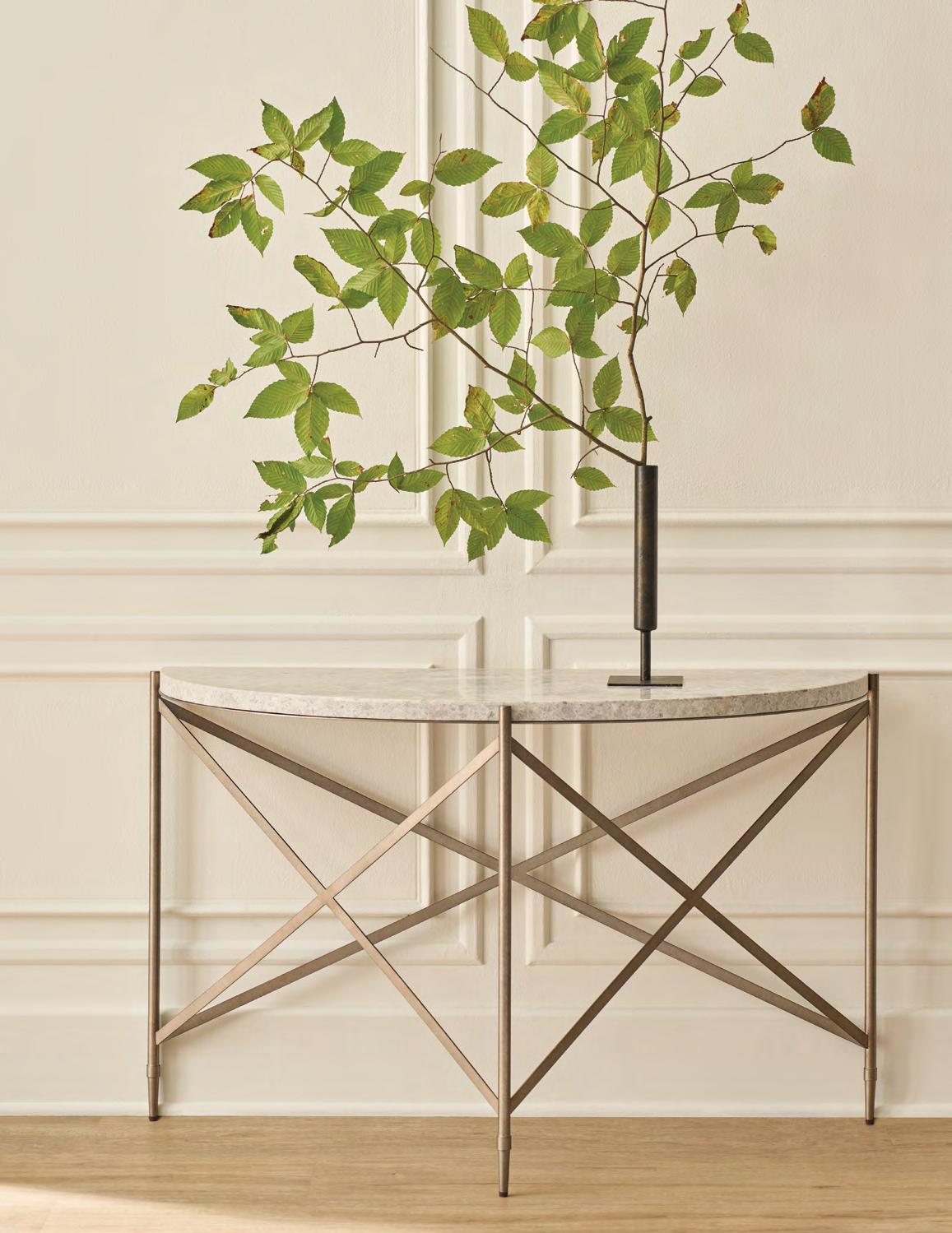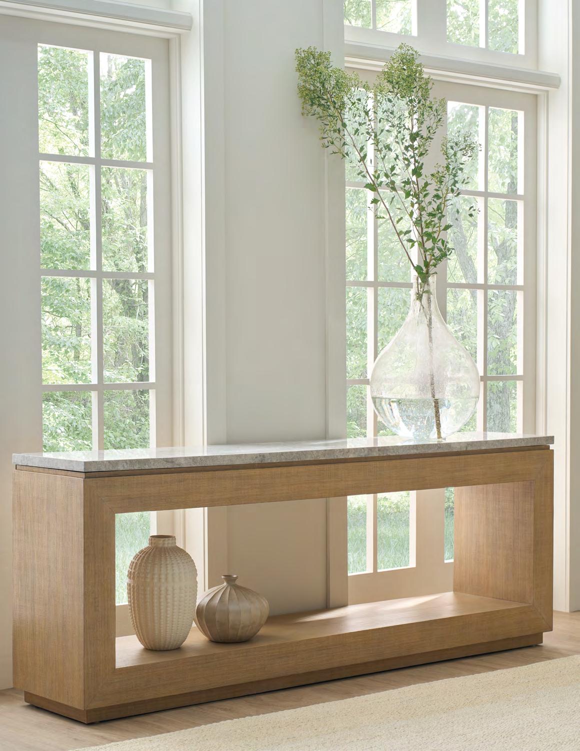 Avaline features light finishes and a harmonious blend of wire-brushed oak solids, plus exquisite accents such as cast aluminum, grey marble and cast glass. Upholstery options, including special order fabrics, give the Avaline Collection versatility and timeless appeal.
