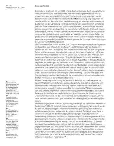 17 Vgl. Ernst Hanisch, Provinzbürgertum und Kunst der Moderne, in: Ernst Bruckmüller u.a. (Hg.), Bildungs bürgertum in der Habsburgermonarchie, Wien 1990, S. 127–139. 18 Verein für Heimatschutz in Steiermark. Nachwort des Statthalters Manfred Graf Clary und Aldringen, in: Tagespost, 19.04.1913. 19 Joseph August Lux, Stadtspaziergänge, IX. Graz, in: Hohe Warte 1 (1904/05), S. 324–325. 20 Zur Vereinsgeschichte vgl. Antje Senarclens de Grancy (Hg.), Identität – Politik – Architektur. Der „Verein für Heimatschutz in Steiermark“, Berlin 2013. 21 Peter Rosegger, Wir müssen uns ein wenig verbauern, S. 208.