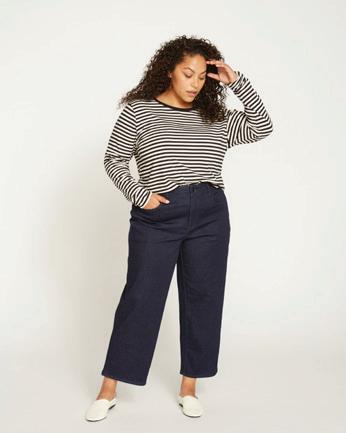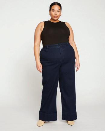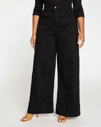 Dramatic wide-leg jeans that are fitted through the waist and hip with an encased elastic at the back waistband for ease.