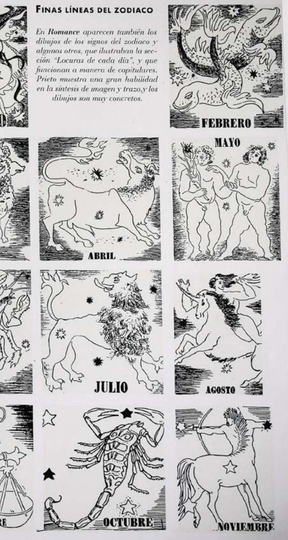 Ilustraciones de los signos zodiacales por Miguel Prieto, revista Romance