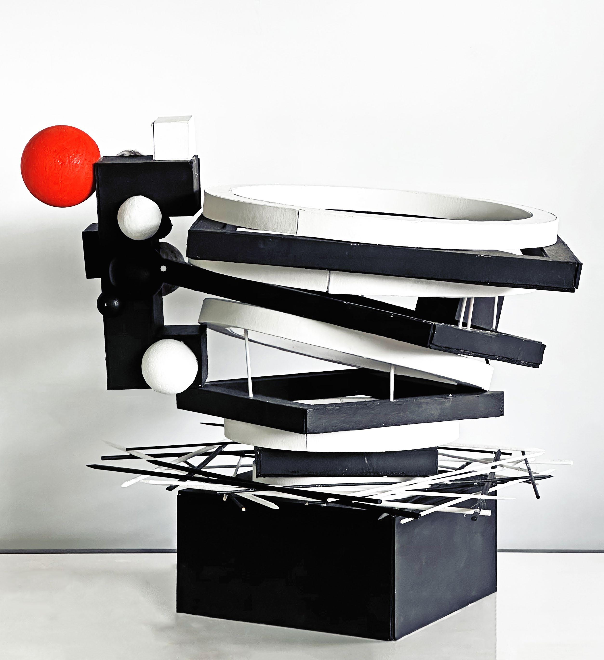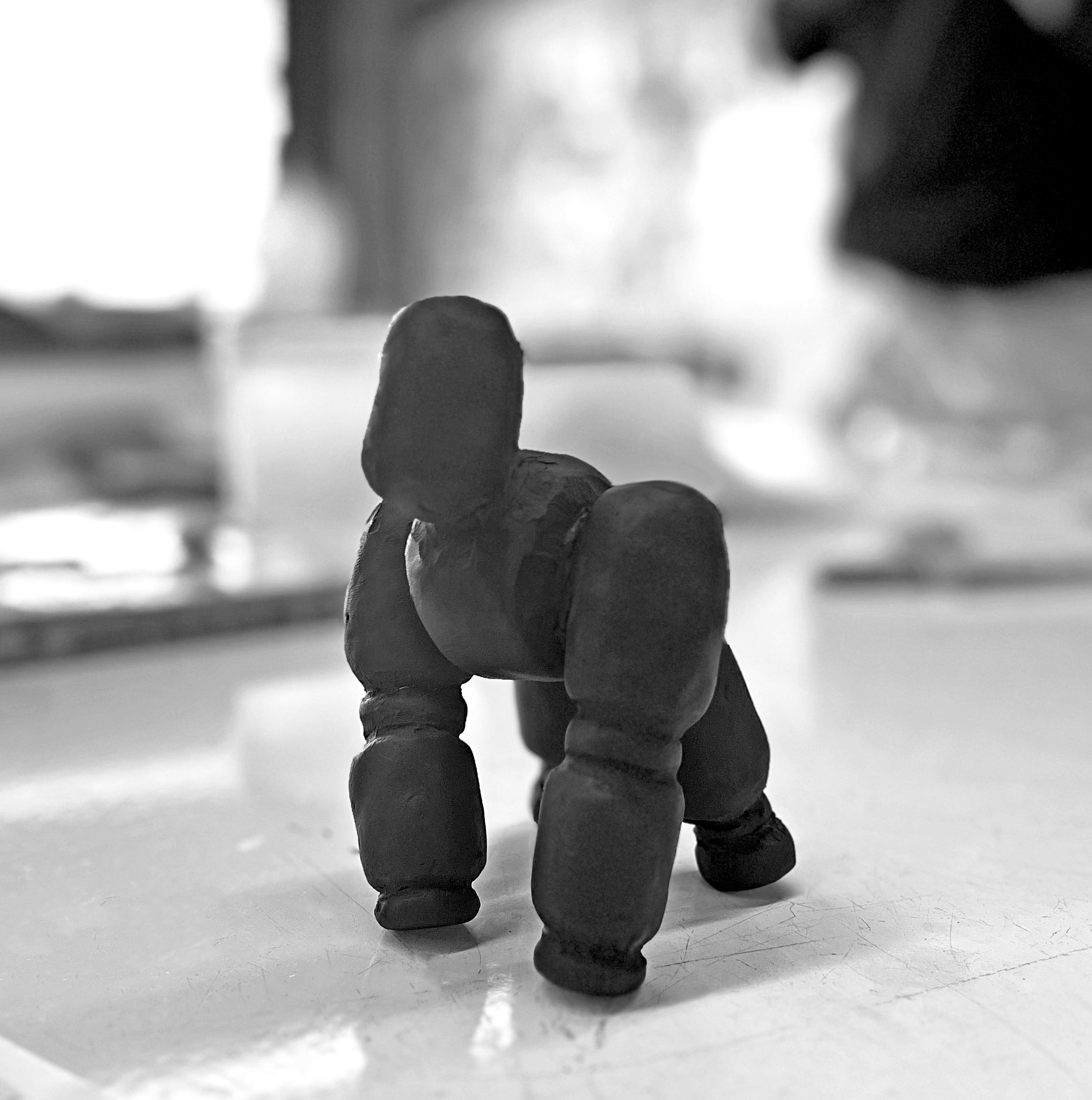 Tras la investigación y análisis del movimiento de un animal a través del dibujo (a), se elaboraron simplificaciones geométricas para lograr modelos con materiales simples (b) con los cuales hacer una valoración de interacción humana. Con volúmenes geométricos se hizo un estudio de dimensiones para lograr el prototipo alfa en el taller (c). El prototipo beta (d) debía ser funcional.