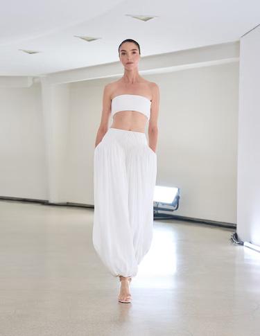 La colección traspasa los límites con esculturales tutús de cuero, fluidos vestidos de satén y vestidos largos de lana anudados en el dobladillo para crear formas frescas y voluminosas. Algunas prendas hablaban más fuerte.