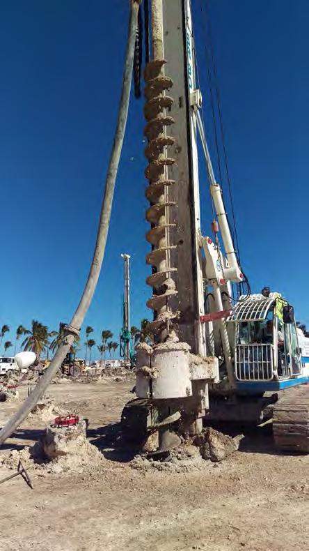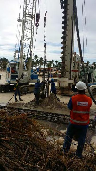 Una vez aprobado el proyecto por el Ministerio de Medio Ambiente, se comenzó con la preparación del terreno. Para poder determinar el tipo de cimentación que se debió emplear, el diseñaros estructural analizo las pruebas de sondeos realizadas en el terreno. En conclusión, el terreno estaba demasiado “licuable” para realizar plateas de cimentación o zapatas aisladas, por lo que se tomó la decisión de realizar pilotes de concreto armado. Estos pilotes se realizaron en el proyecto. Primero se realizaron las mediciones y los replanteos topográficos de la posición geográfica de los edificios, utilizando los planos arquitectónicos como base. Posterior a este proceso, se fueron marcando en el terreno los puntos de perforación para “hincar” os pilotes. En el terreno se instalaron los talleres correspondientes para fabricar los armados y encamisados, una vez se hizo el espacio en el punto topográfico determinado, se fueron colocando estos elementos de acero armado con maquinaria pesada. El proyecto en su totalidad cuenta con aproximadamente 2,300 pilotes. Durante el proceso de armado se fueron realizando pruebas de resistencia del concreto, así como pruebas de resistencia de los pilotes mediante métodos de compactación de carga estable y carga de impacto. Los resultados fueron tanto favorables como no favorables, se tuvo una temporada en donde el concreto estaba llegando con exceso de arena y poco concreto, por lo que se devolvieron miles de metros cúbicos de concreto. Las pruebas de resistencia al no ser aprobadas, lo que se realizaba era una demolición de los elementos y se iniciaba el proceso desde cero. Solo se dejaba el acero armado del pilote de desplante. A continuación, se presentan fotografías de campo del proceso de pilotaje, pruebas y aprobaciones del proyecto.
