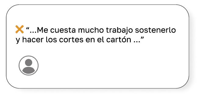 El manejo del cutter se describe como una actividad que requiere un esfuerzo considerable. Los entrevistados mencionan la necesidad de realizar múltiples pasadas para lograr un corte adecuado, lo que resulta en un desgaste físico, particularmente en las manos. Este problema es especialmente evidente al trabajar con materiales más duros como el cartón, donde tanto las tijeras como el cutter muestran limitaciones. La repetición de movimientos, sumada a la necesidad de aplicar fuerza, genera fatiga y disminuye la eficacia del proceso, afectando negativamente la experiencia creativa.