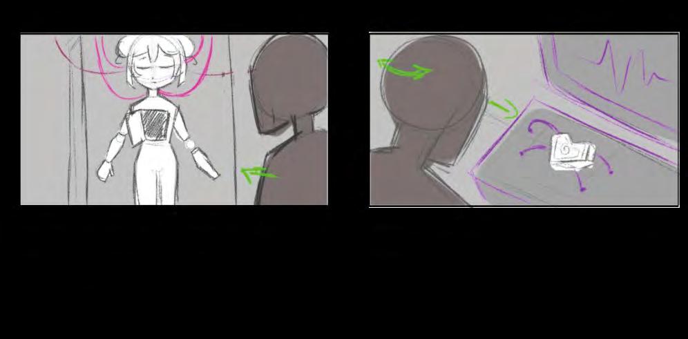Parte del teaser donde el científico crea a AI, en esta escena se ve al científico sosteniendo el alma que le será otorgada al androide. Se emplea principalmente el color azul para simbolizar la tecnología presente en el laboratorio. Esto se debe a que dicho color está relacionado con conceptos como la innovación, la modernidad y la sofisticación. Por otro lado, para representar el alma del androide, se optó por representarlo mediante un corazón, ya que este órgano es fundamental para la vida humana.