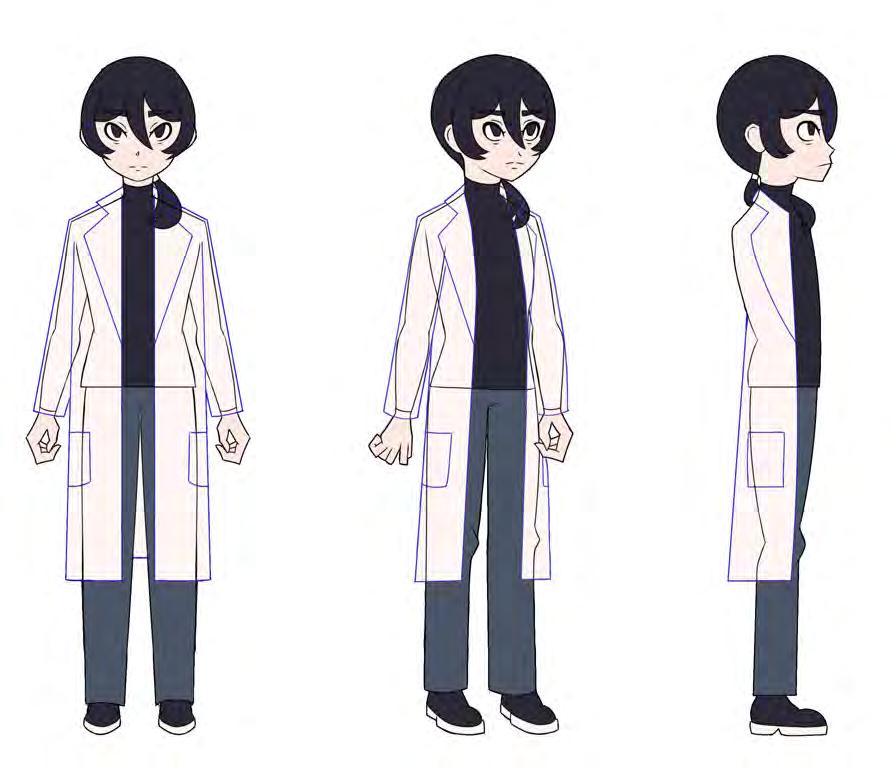 En contraste con AI, se eligió un diseño más simple para el científico, que se asemeja a un humano común sin colores extravagantes. El concepto del científico fue rediseñado para alinearse con el diseño final de AI.
