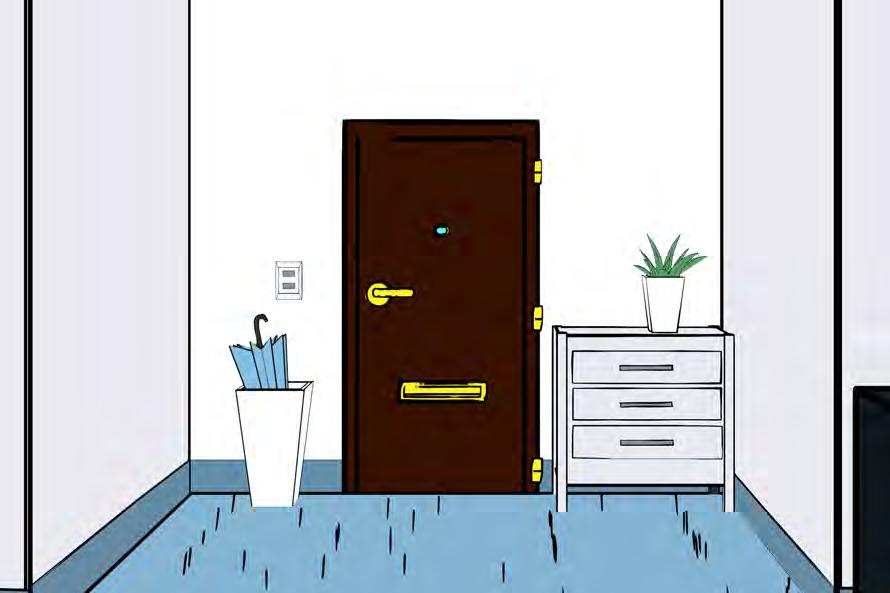 Para la decoración de la entrada, se tomó como referencia la representación común de los departamentos en las series de anime. Estos suelen incluir un mueble ubicado junto a la puerta y un soporte para paraguas. En la elección de la paleta de colores, se optó por tonalidades de baja saturación, lo cual busca transmitir la sensación de melancolía que caracteriza este espacio.