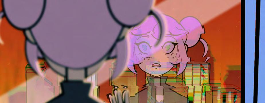 La escena muestra como la protagonista observa cómo la ventana, que creía real, comienza a fallar y apagarse, revelando que en realidad era un holograma. El uso del color rojo simboliza el peligro en la ciudad. A través del reflejo de la protagonista, el espectador puede apreciar las emociones de temor y sorpresa que experimenta en ese momento.