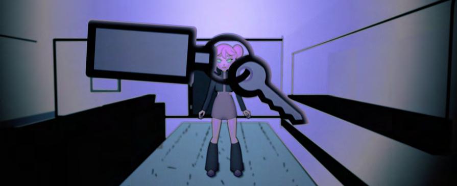 Después de reflexionar sobre lo sucedido, AI recuerda la llave que se había caído del bolsillo del científico, siendo esta la clave para resolver su incertidumbre. En la escena, se desenfoca el fondo para resaltar al personaje principal y el objeto sobre la mesa. La mirada del personaje se dirige hacia las llaves, orientando así la atención del espectador hacia este elemento crucial para la trama, que le permitirá a la protagonista desvelar la verdad y liberarse de su situación.