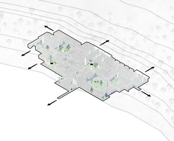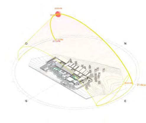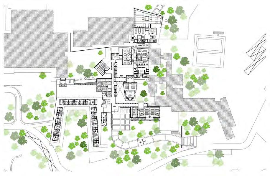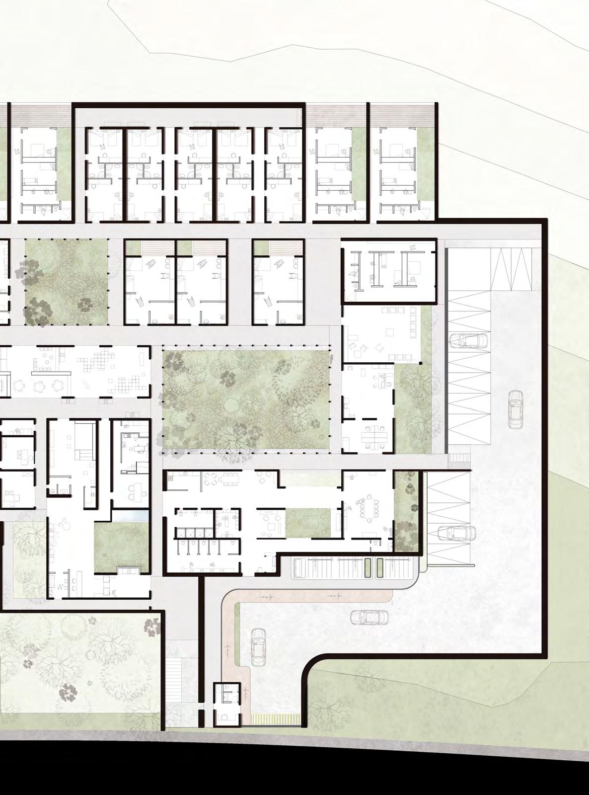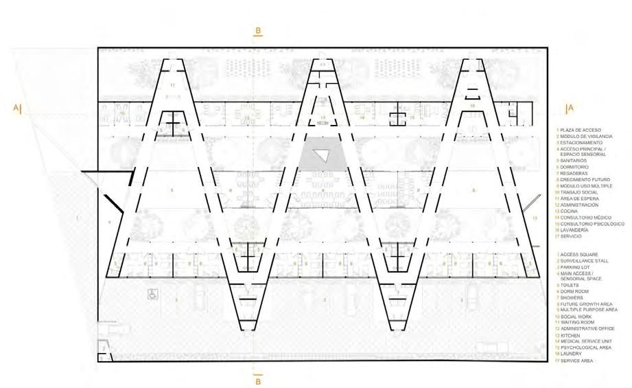 Explosivo de áreas de atención integral, mostrando el uso del espacio con escalas humanas que permitan la representación cotidiana de como habitar el espacio, todo espacio verde esta enfocado a la introspección de cada usuario, invitandolo en todo momento a reflexionar y meditar, garantizando espacios adecuados de trabajo y de atención. Estas áreas estan ubicadas a cierta distancia de las salas recreativas para que amabas no tengan interrupción acústica y no llegar a afectar las sesiones de asesorías o terapias.