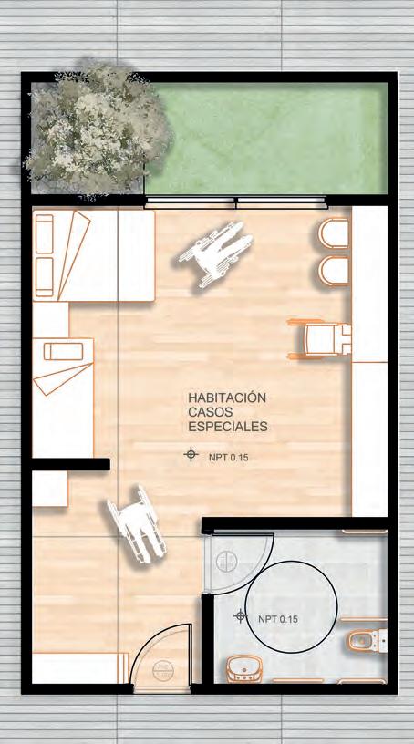 Estos espacios cuentan con las dimensiones específicas para usuarios con discapacidad, utilizando equipo como cama de hospital, camas individuales para los acompañantes, espacio de repisa, mesa tipo escritorio con silla, un baño privado con sus elementos de apoyo e incluyendo un pequeño jardín como apoyo visual, haciendo el uso de la instrospectiva en espacios privados.