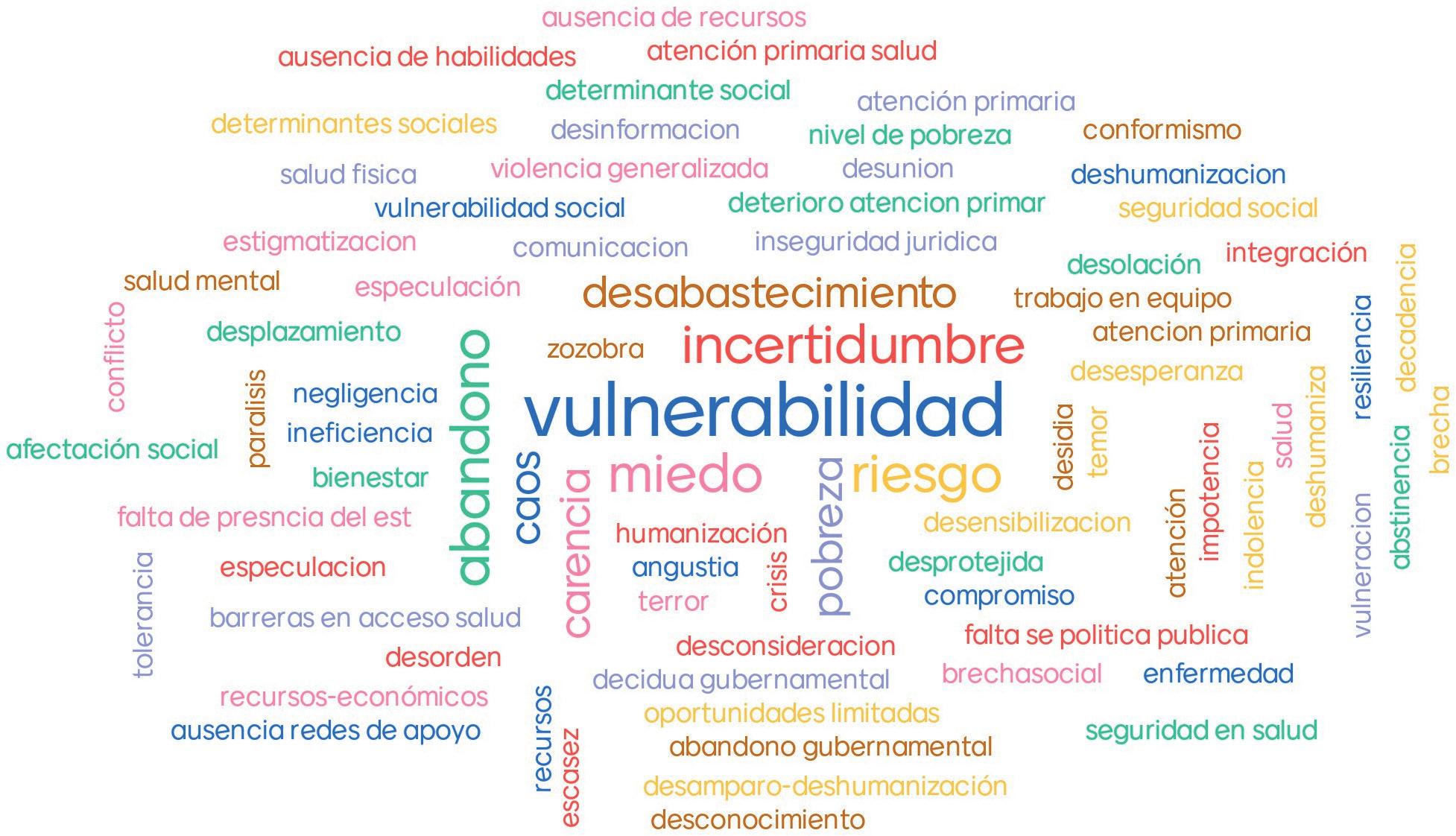 La “Vulnerabilidad” y "Escasez de recursos" destacan la falta de recursos médicos, relacionándola con el financiamiento en los sistemas de salud y con determinantes sociales de la salud referidos y al acceso a alimentos y servicios básicos. Esta escasez está directamente relacionada con la calidad de vida de los individuos y aumenta la vulnerabilidad de las comunidades.