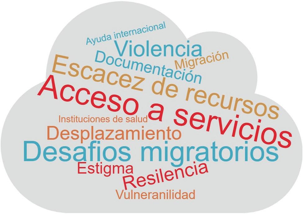 El término "Acceso a servicios de salud" ocupa un lugar central en la nube y evidencia una contradicción estructural en el sistema, situación sintetizada por Chernichovski (2010) al argumentar que: “Colombia tiene el mejor modelo de sistemas de salud de América Latina, pero carece de una buena implementación” (p. 16). Esta problemática se menciona reiteradamente en varios contextos, y refiere la falta de acceso a servicios médicos adecuados, lo cual cimienta una barrera continua para la salud y el bienestar de las poblaciones locales y migrantes. En ese orden de ideas, los "Desafíos migratorios" abarcan las numerosas dificultades que enfrentan los migrantes, incluyendo obstáculos legales, sociales, culturales y económicos que complican su capacidad para integrarse y acceder a servicios esenciales. Por otra parte, las “Instituciones de salud” son evaluadas críticamente por su insuficiente capacidad para manejar crisis y responder efectivamente a las necesidades de la población en su función de garantizar el acceso a servicios integrales, integrados y colectivos.