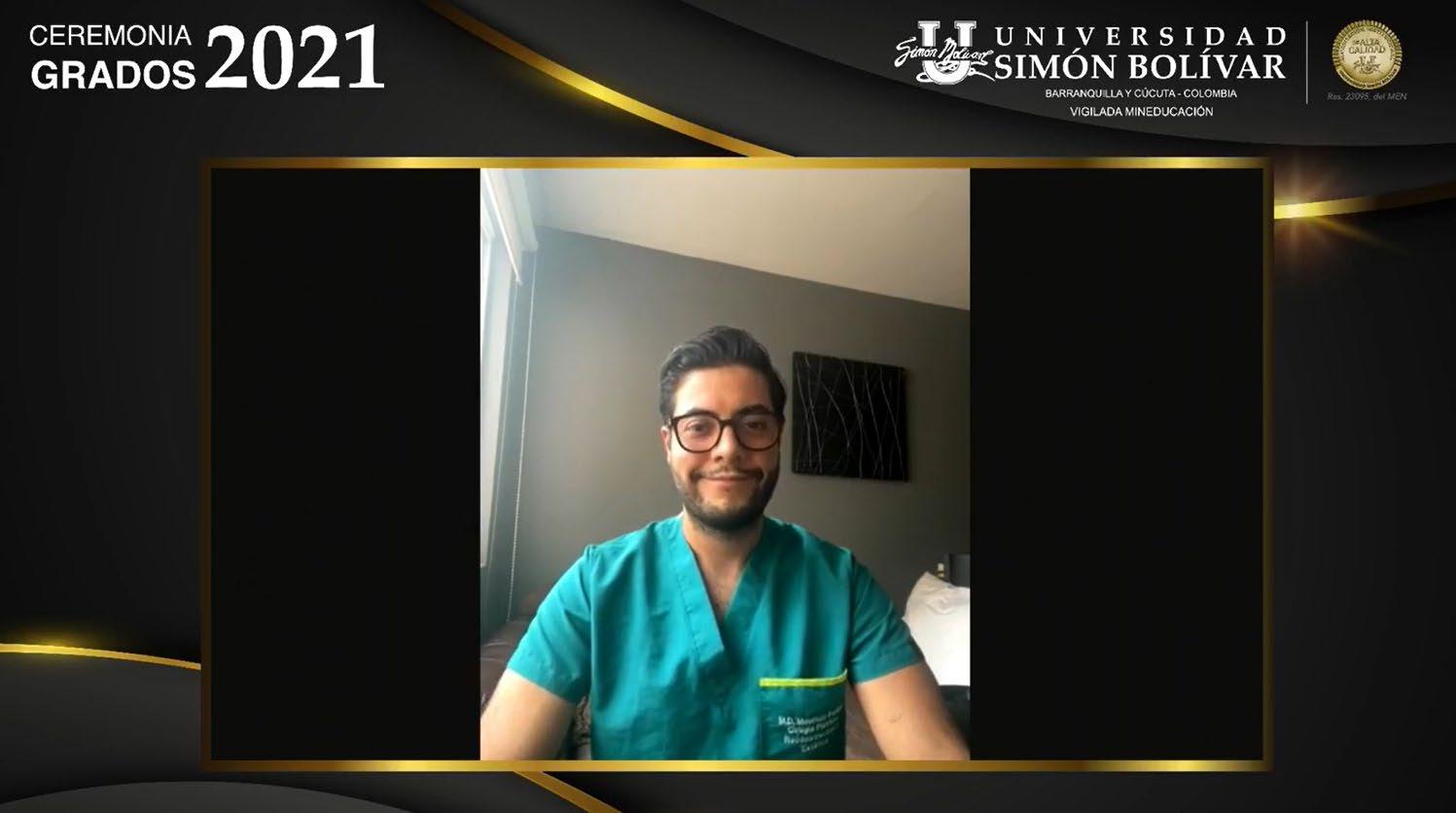 Sin embargo, el país continúa en estado de emergencia sanitaria ocasionada por la pandemia de Covid-19 y como muchas otras familias en Colombia y el mundo algunos de los presentes también han sufrido la partida anticipada de seres queridos que hoy hubieran estado rebosantes de felicidad por sus logros. Este virus ha transformado la forma de relacionarnos, pero seguimos adelante y, por ello, hoy nos encontramos celebrando esta ceremonia de manera híbrida desde múltiples escenarios, manteniendo en la medida de las posibilidades el protocolo universitario que nos caracteriza para hacer de este acto el momento solemne y especial que nos permita disfrutar de la felicidad que representa alcanzar este logro tan importante.