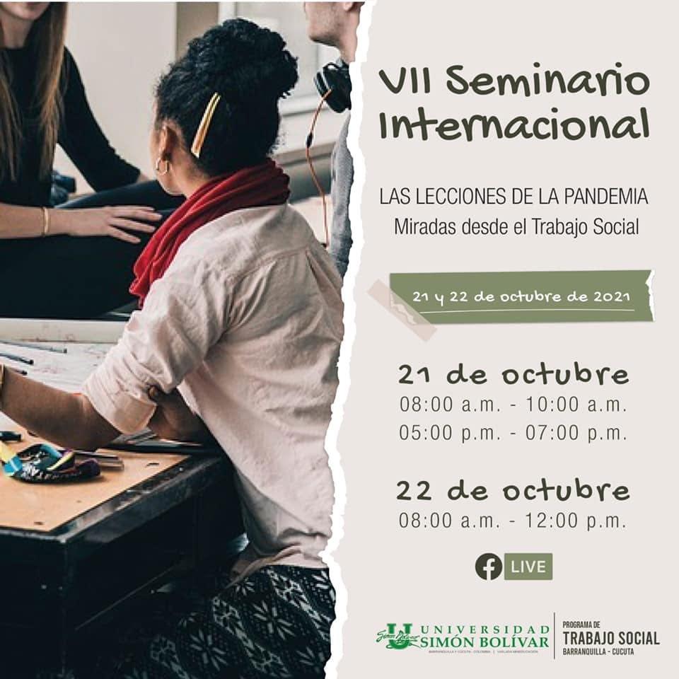 En el marco de la conmemoración del Día del Trabajo Social en Colombia, la Universidad Simón Bolívar y su programa de Trabajo social, tanto en su sede Cúcuta como Barranquilla, se unieron para ofrecer a toda la comunidad académica el VII Seminario Internacional: Lecciones de la pandemia, miradas desde el Trabajo Social, un evento que reúne diferentes profesionales en el área del Trabajo Social nacionales e internacionales.