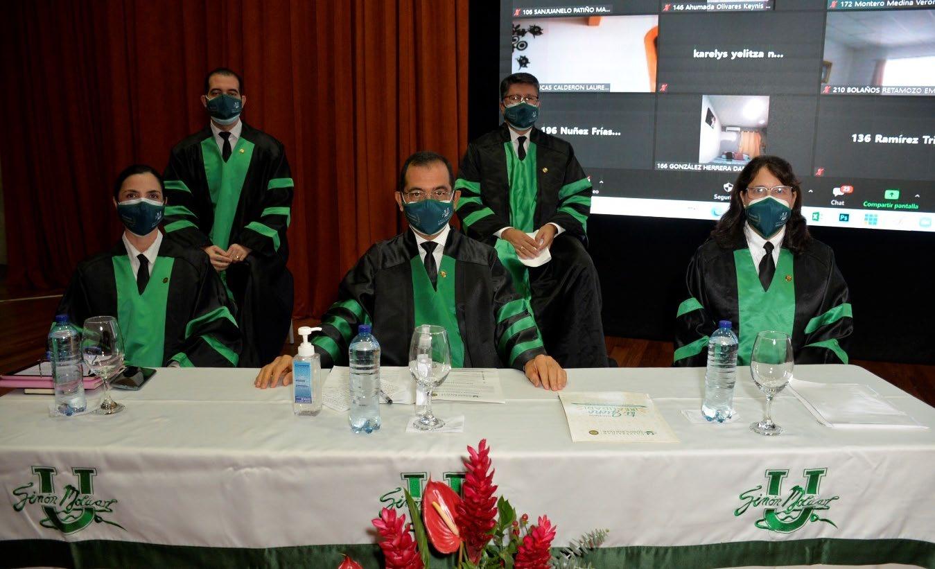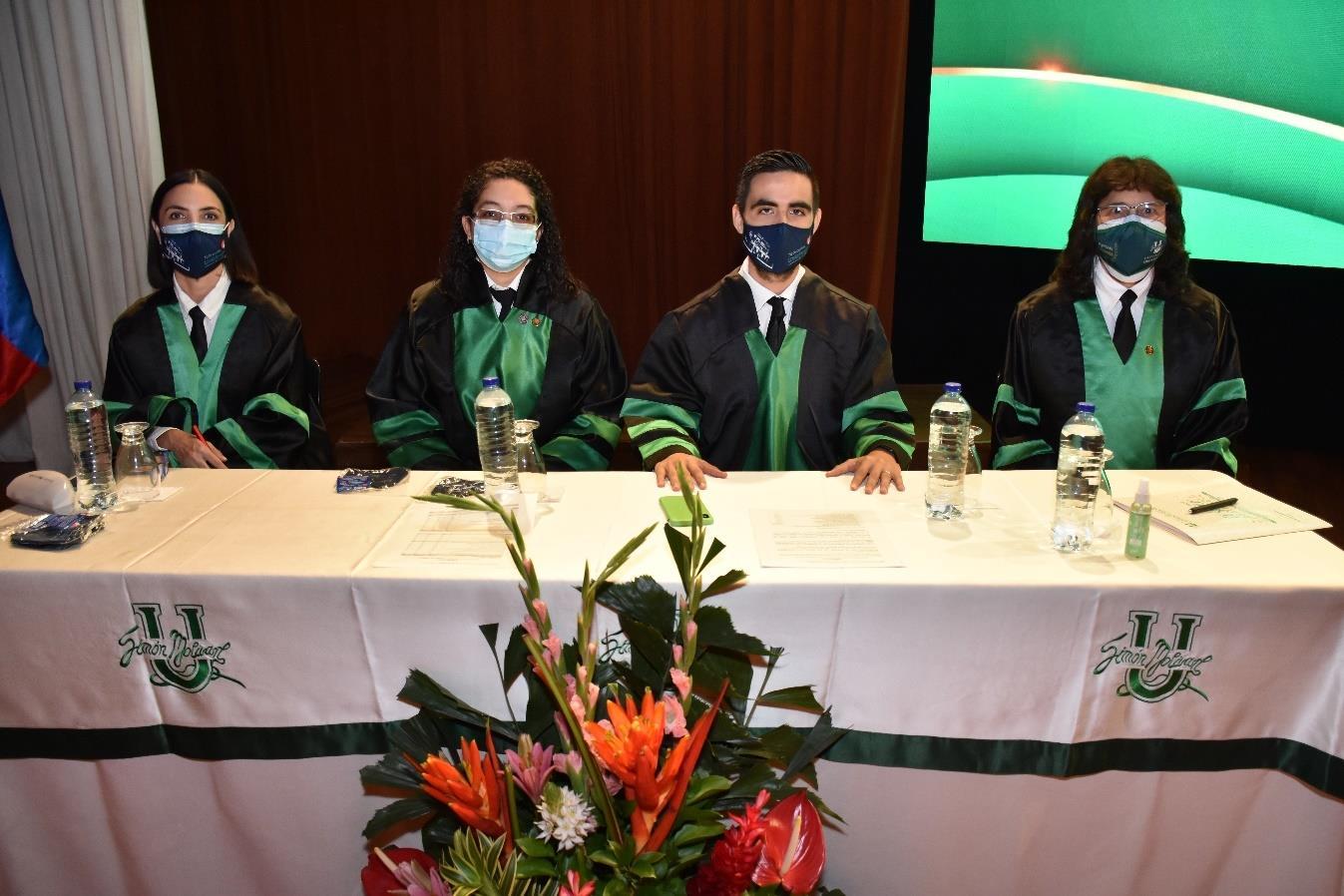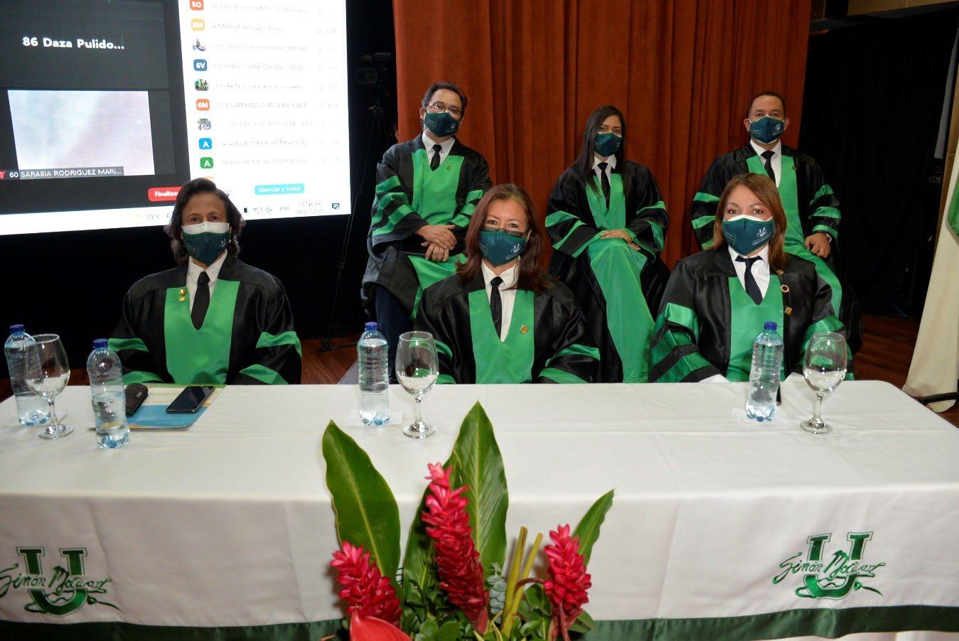 Por motivos de bioseguridad y aforo del teatro, la ceremonia fue presidida de manera presencial por la Sala General, representada por el rector de la Universidad, José Consuegra Bolívar; el representante legal y decano de la Facultad de Ciencias de la Salud, José Consuegra Machado; la vicerrectora académica, Sonia Falla; la secretaria general, Rosario García, y el decano de la Facultad de Ciencias Básicas y Biomédicas, Álvaro Flórez.
