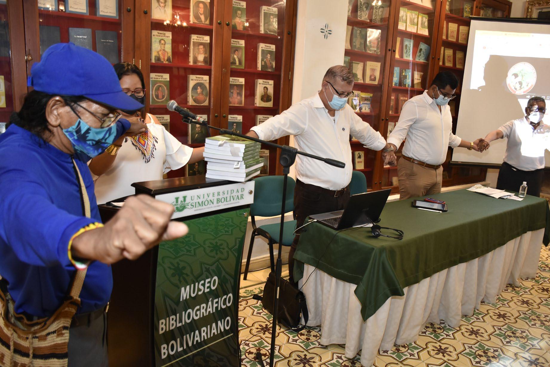 Para iniciar la presentación del libro, miembros de la comunidad indígena Mokaná realizaron un acto de armonización espiritual propio de sus costumbres y rituales, dirigido por Miguel Jiménez y Alfonso Santiago Barrios, médicos tradicionales.