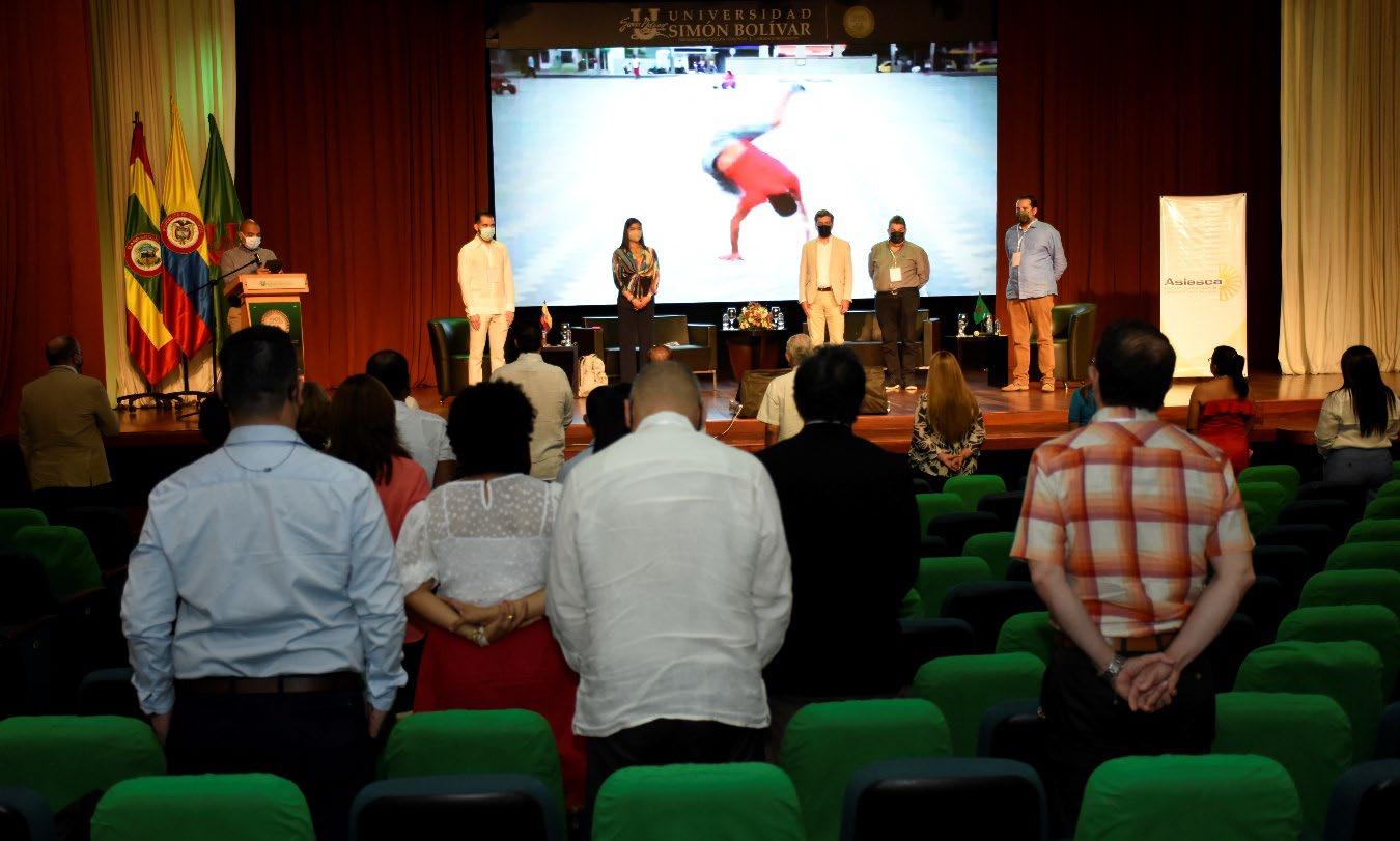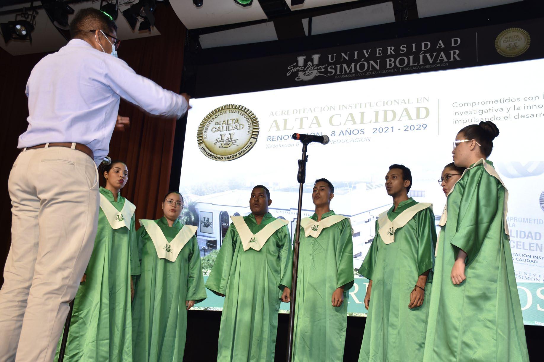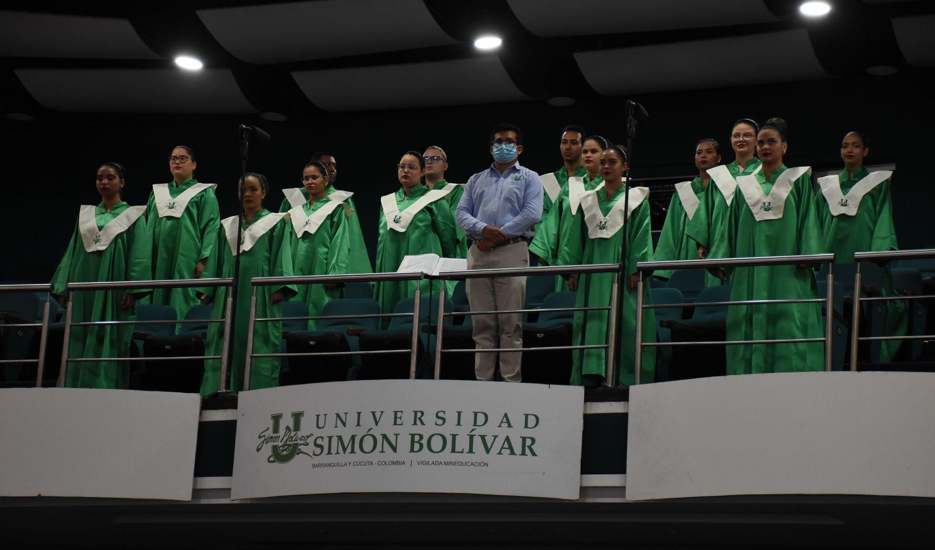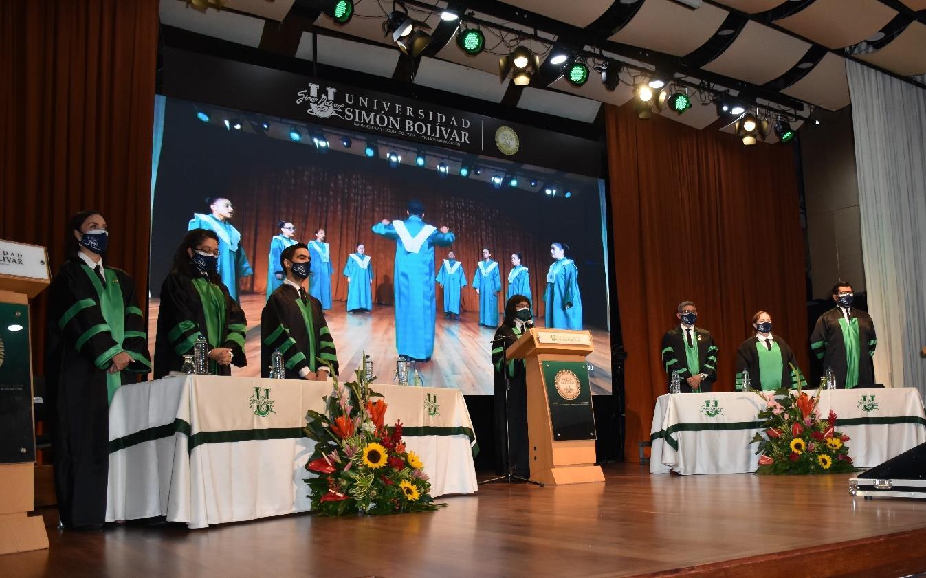 Manteniendo en la medida de las posibilidades el protocolo universitario característico de este acto solemne y especial, la Coral Bolivariana grabó con antelación la entonación de los himnos de la Universidad Simón Bolívar, de Colombia y de Barranquilla, dirigidos por el maestro Eduardo Amaranto Padilla.