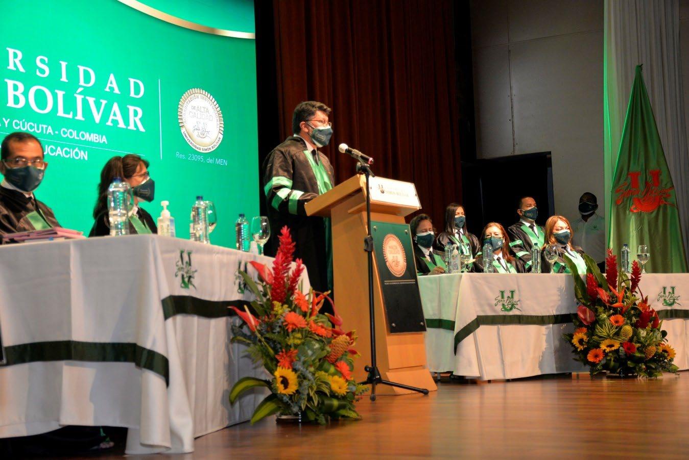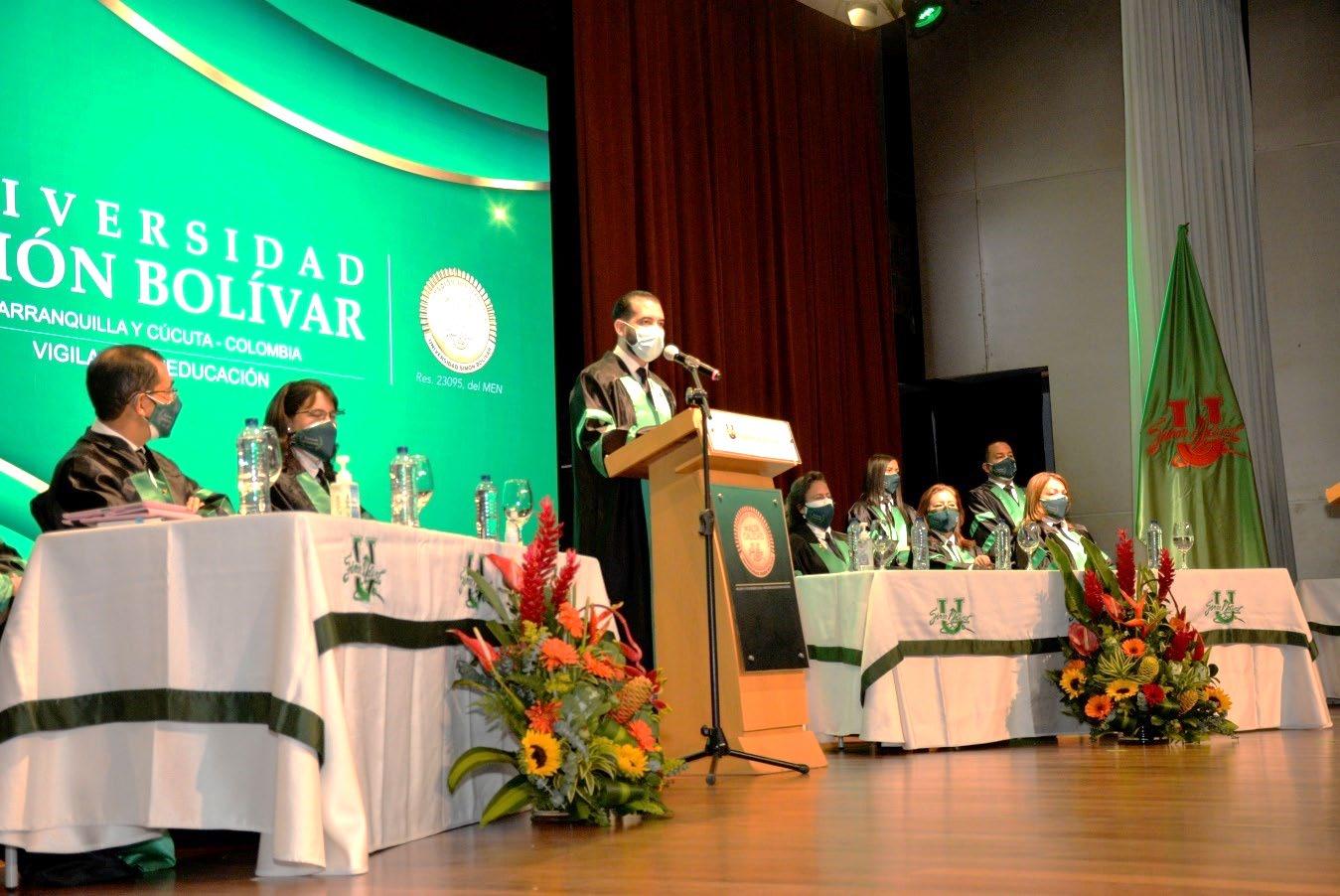 Sin duda, una de las fechas especiales que para cualquier directivo académico relaciona como las de mayor recordación y de mayor alegría al vivirla es esta actividad que hoy de manera presencial realizamos, la graduación de nuestros alumnos. Y no solamente del rector y de los directivos, sino también de los profesores, del personal administrativo, académico y, por supuesto, de ustedes que son los actores principales, ya que se llevan la mayor alegría y felicidad de este sueño realizado Para mí, de manera personal, les expreso con mucho cariño que es fecha de siempre recordar y fecha en que me alegra en el espíritu poder estar aquí presidiendo este acto y diciendo estas palabras de “despedida”, porque realmente ustedes simplemente pasan a un nuevo escenario y a un nuevo espacio que es el de las responsabilidades laborales, pero continúan siendo bolivarianos, continúan teniendo esta como su Alma Mater, como su madre en los temas académicos y de estudios. Y esa es, además, una pretensión nuestra, poder seguirlos acompañando en la consolidación de su vida profesional.