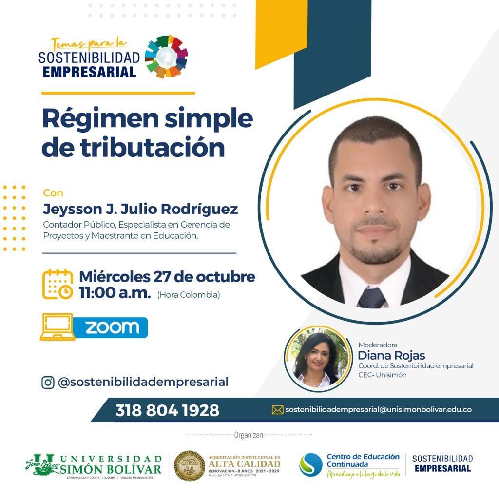 Desde el área de Sostenibilidad Empresarial del Centro de Educación Continuada de la Universidad Simón Bolívar te invitamos a participar de los #TemasParaLaSostenibilidadEmpresarial, en el webinar 'Régimen simple de tributación'.