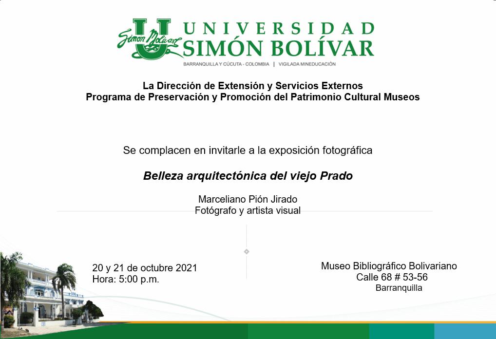 La Dirección de Extensión y Servicios Externos con su Programa de Preservación y Conservación del Patrimonio Cultural Museos de la Universidad Simón Bolívar organizó la exposición fotográfica ‘Belleza arquitectónica del viejo Prado’, una exhibición de fotografías tomadas desde el lente del maestro Marceliano Pion Jirado, arquitecto y fotógrafo de profesión, que exalta a través de sus imágenes la riqueza histórica que resguardan las casonas del tradicional barrio El Prado de Barranquilla.