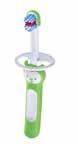 Die ergonomische und rutschfeste Baby‘s Brush hilft sicher bei der Entwicklung von eigenständigen Zahnputzfähigkeiten. Sicherheitsschild für alle Bürsten: Der aufsetzbare Sicherheits schild ist eine Sicherheitsinnovation, die hilft, die Bürste in einem sicheren Abstand zum hinteren Mundbereich des Babys zu halten.