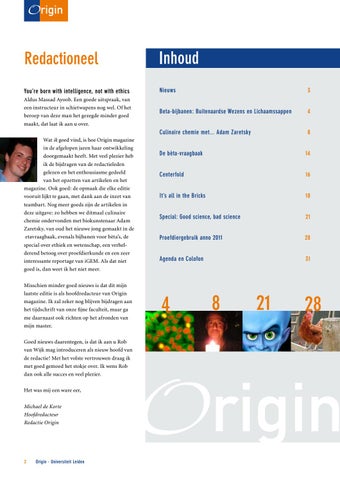 Wat ik goed vind, is hoe Origin magazine in de afgelopen jaren haar ontwikkeling doorgemaakt heeft. Met veel plezier heb ik de bijdragen van de redactieleden gelezen en het enthousiasme gedeeld van het opzetten van artikelen en het magazine. Ook goed: de opmaak die elke editie vooruit lijkt te gaan, met dank aan de inzet van teambart. Nog meer goeds zijn de artikelen in deze uitgave: zo hebben we ditmaal culinaire chemie ondervonden met biokunstenaar Adam Zaretsky, van oud het nieuwe jong gemaakt in de βetavraagbaak, evenals bijbanen voor bèta’s, de special over ethiek en wetenschap, een verhelderend betoog over proefdierkunde en een zeer interessante reportage van iGEM. Als dat niet goed is, dan weet ik het niet meer. Misschien minder goed nieuws is dat dit mijn laatste editie is als hoofdredacteur van Origin magazine. Ik zal zeker nog blijven bijdragen aan het tijdschrift van onze fijne faculteit, maar ga me daarnaast ook richten op het afronden van mijn master. Goed nieuws daarentegen, is dat ik aan u Rob van Wijk mag introduceren als nieuw hoofd van de redactie! Met het volste vertrouwen draag ik met goed gemoed het stokje over. Ik wens Rob dan ook alle succes en veel plezier. Het was mij een ware eer, Michael de Korte Hoofdredacteur Redactie Origin