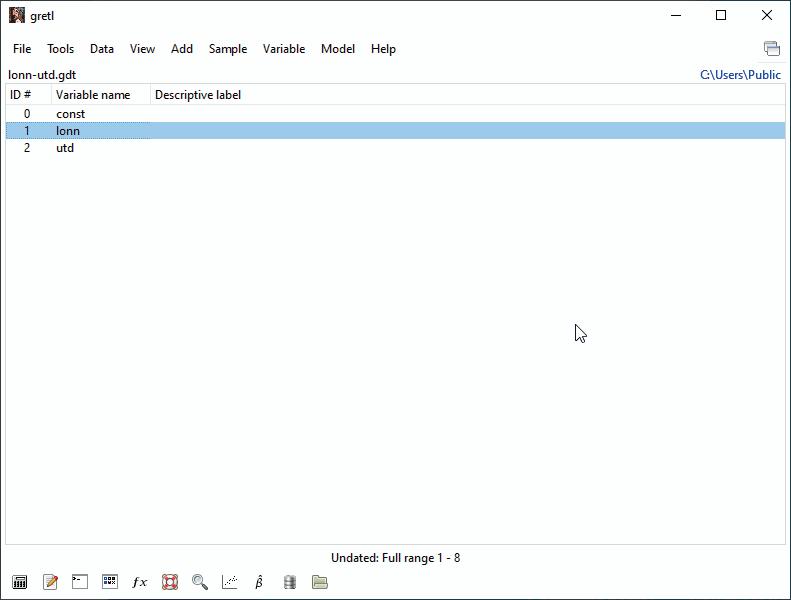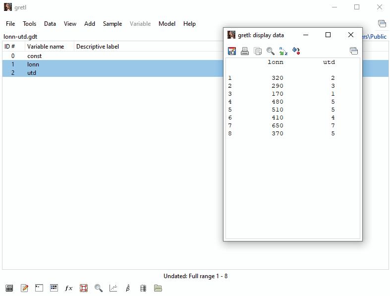 Dettevilherrefererestilsom hovedvinduet iGretl,sidenmanogsåfår oppmangeandrevinduervedulikeberegningerogestimeringer.Idette hovedvinduetvilvihaoversiktovervariableneidatasettetvårt.Laosssiat viharetutvalgpååttepersoner, i 1,..., 8,dervikjennerlønnsinntekten måltitusenkroner Yi ogutdanningmåltiantallårettervideregåendeskole Xi .Dettegiråtteobservasjonspar: