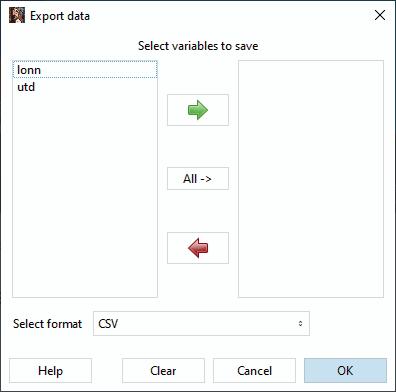 ItilleggkanvieksportereetdatasetttilenfilsomkanåpnesiExcelved åvelge File>Exportdata.Vikandavelgevariableneviønskerålagre (All-> foråhamedalle)somvistifigur2.7.Velgf.eks.formatCSV (CommaSeparatedValue),somkanåpnesdirekteiExcelellerandreprogram.Deretterkanvivelge semicolon som separatorfordatacolumns og comma som decimalpointcharacter,noesompasserbestmednye norskeversjoneravExcel.
