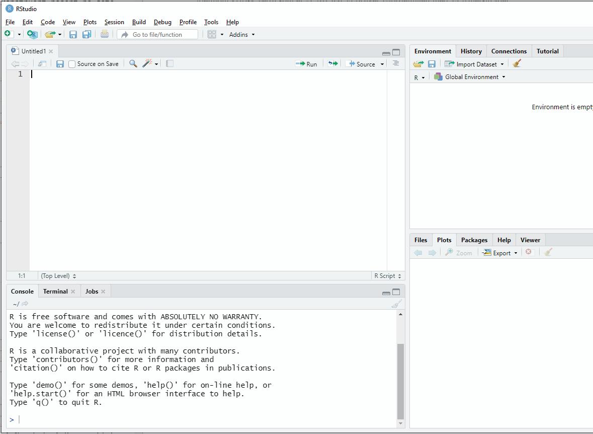 Etteroppstartharvitrepanelersombrukes.Tilvenstreligger“Console”, somerområdetdervikanskrivekode.Øversttilhøyrefinnerviblant annet“Environment”,somvilvisevariablerellerandreobjektersomvi jobbermed,ognedersttilhøyrevilf.eks.figurervisesunderfanen“Plots”.