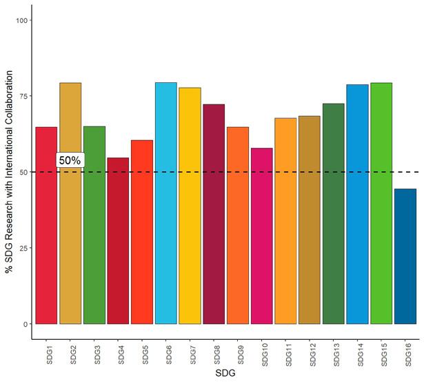 It is not possible to identify specific research aligned with SDG 17 (Partnerships for the Goals) so this is not included in Figure 1 or 2. On the report page for SDG 17 we show the total metrics for our SDG aligned research.