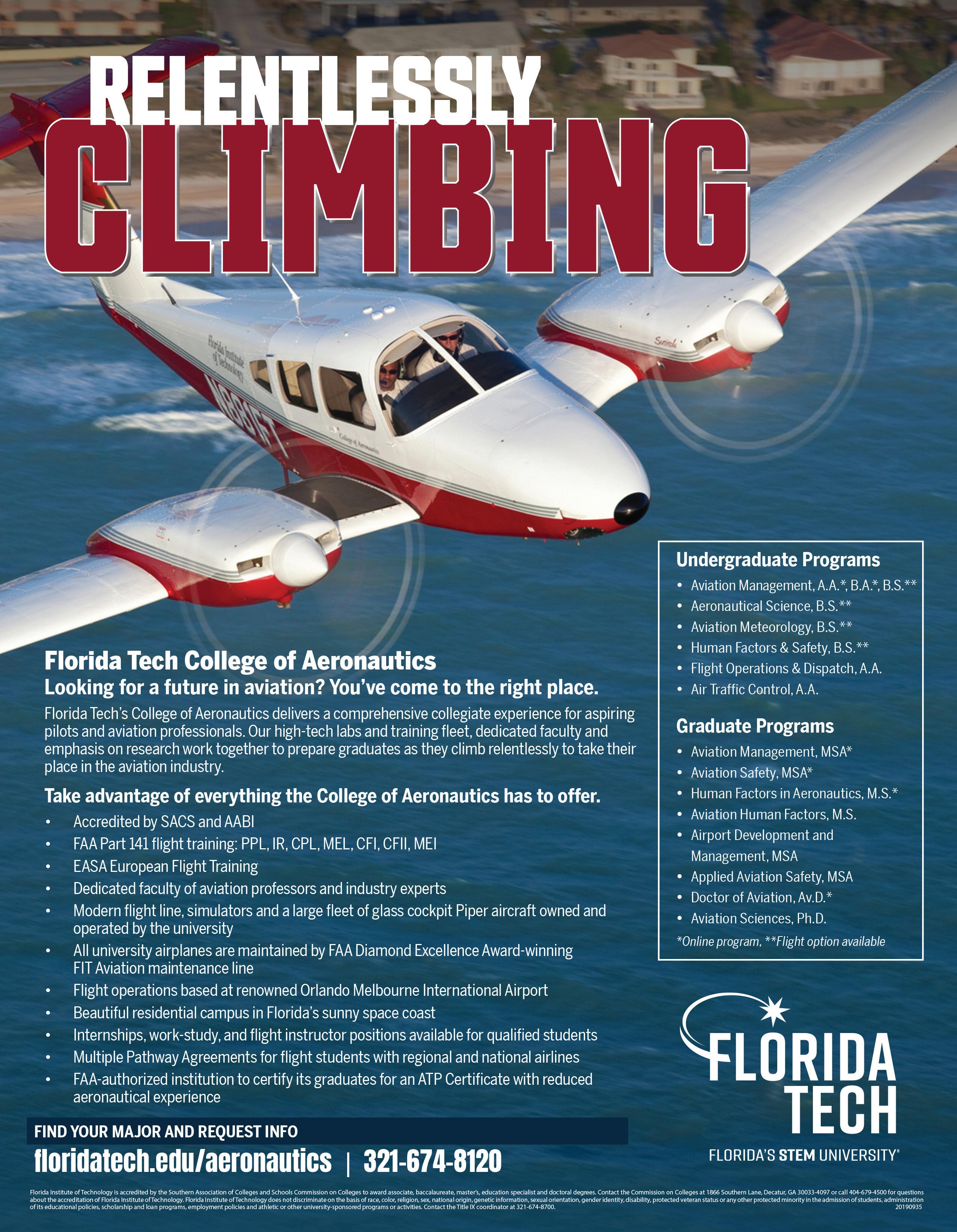 We are pleased to offer this 2023 edition of the Collegiate Aviation Guide. The Guide is a directory of departments in the U.S., Puerto Rico, Canada, and abroad that offer academic degrees and/or majors in aviation. The institutions listed in this Guide are accredited by a regional or national accrediting organization as a degree granting institution and/or are listed in the 2023 edition of the Higher Education Directory. The intent of this Guide is to serve as a useful reference to prospective undergraduate and graduate students, as well as educators, and industry and government personnel. For high school students and parents in search of a college or university, we suggest using the Guide as an initial screening device to identify those institutions and locales that are appropriate for the student’s educational goals and individual needs. Students should then contact the institutions directly for detailed, current information. As part of the process of finding the perfect program, study the information available from several institutions, then follow-up with a personal visit to the institutions. The final decision should be based on consideration of all factors that relate to the individual student.