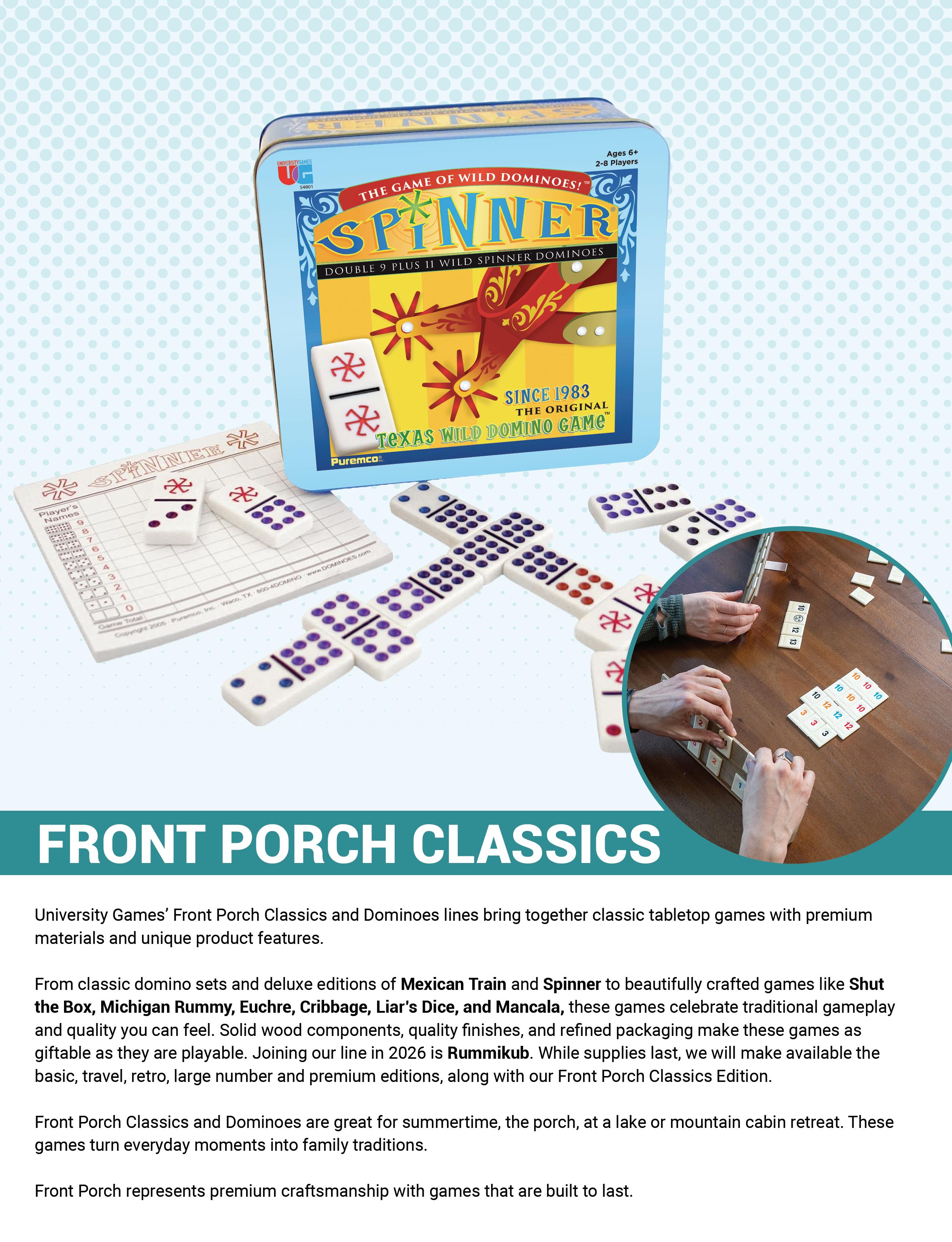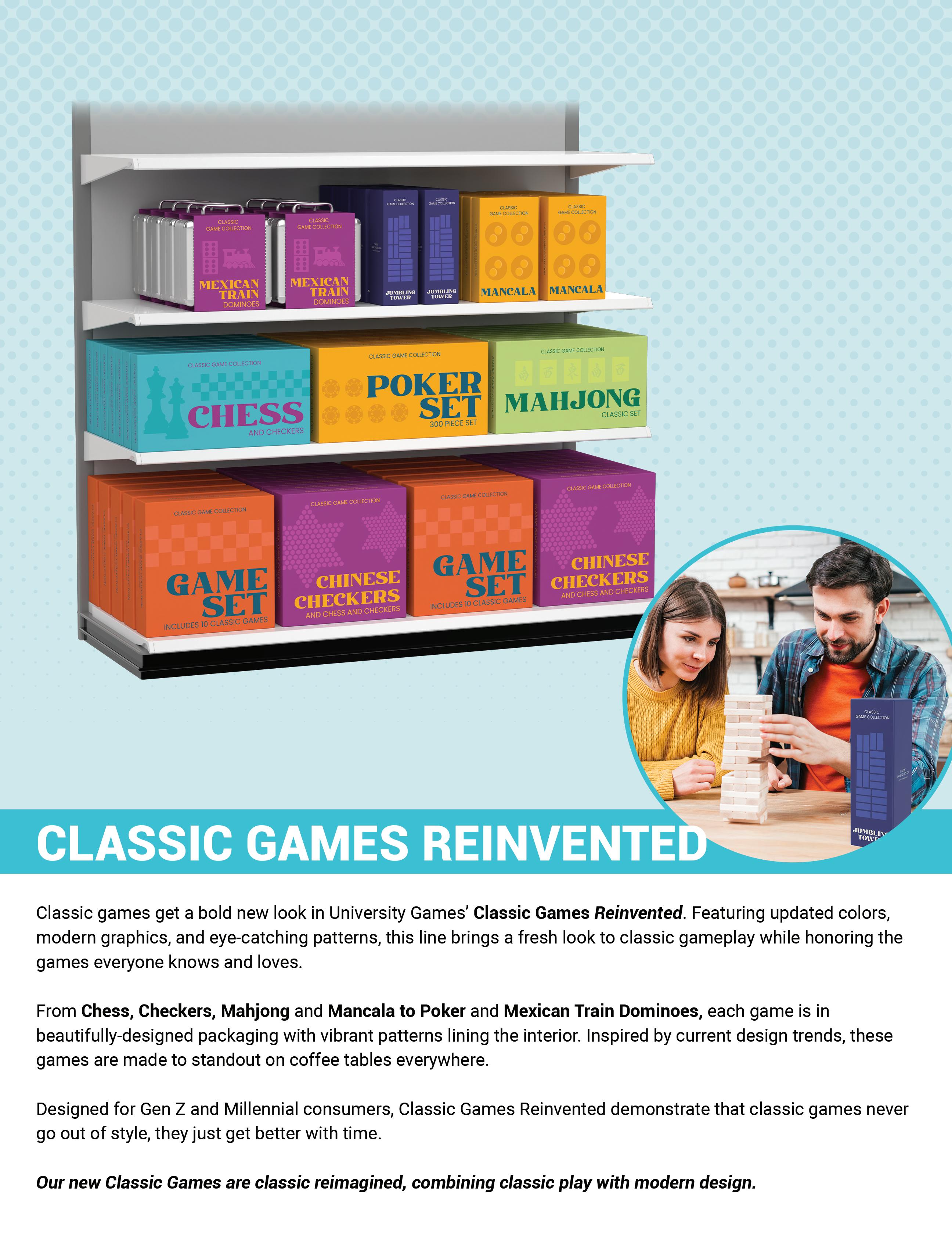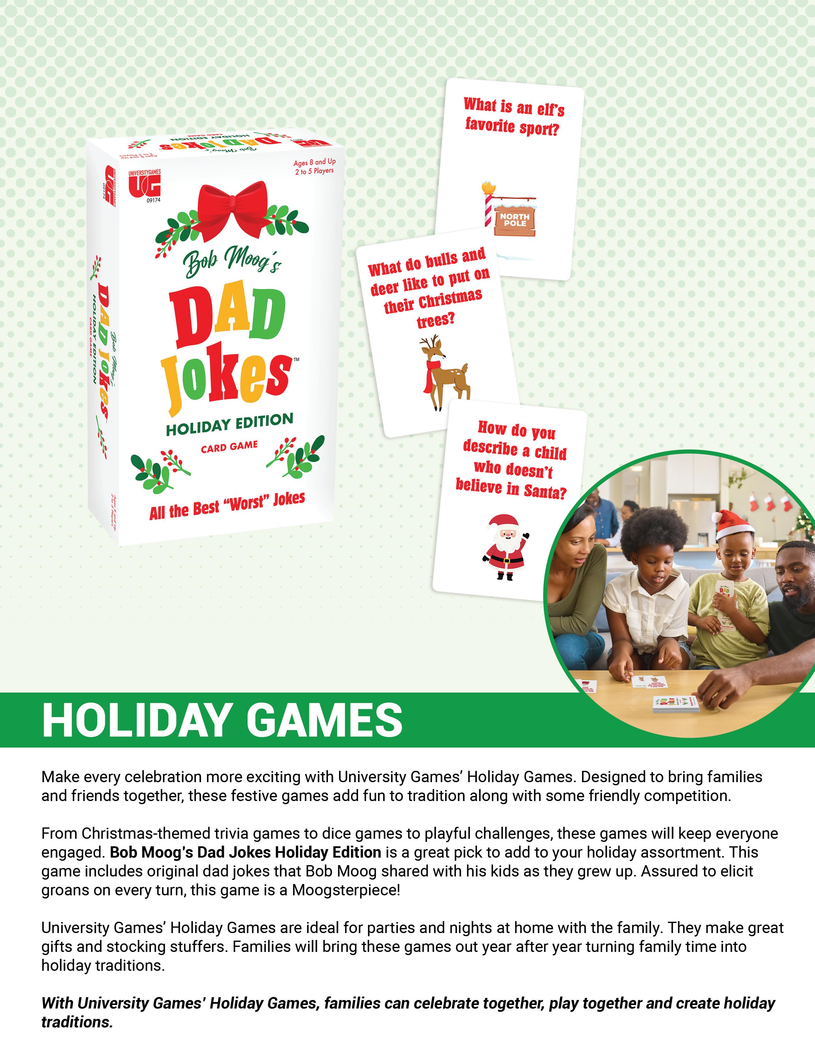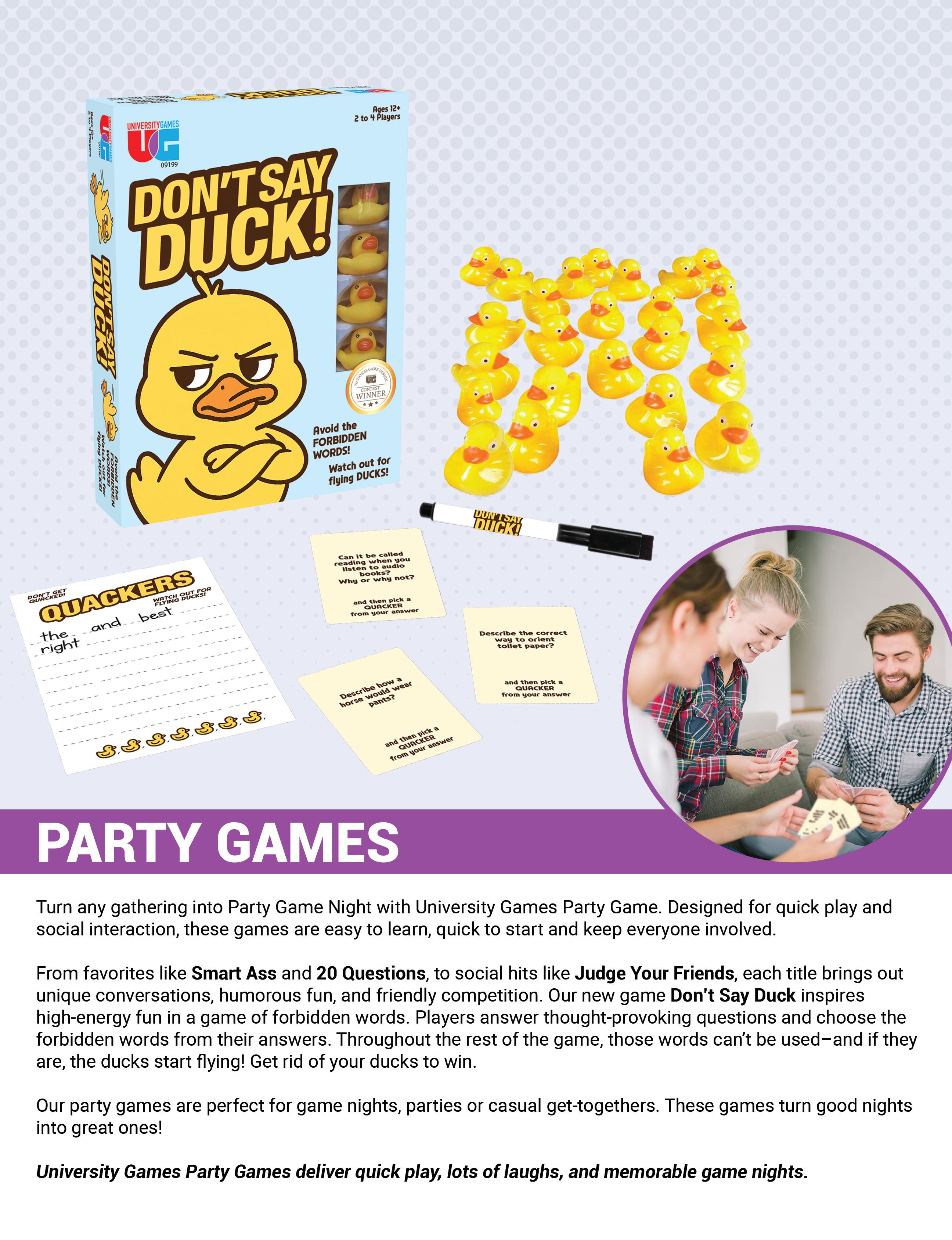 Some products featured are prototypes and may differ when manufactured in content, size, appearance and/or play from the images and descriptions represented in this catalog. © 2026 University Games Corporation. BePuzzled, the BePuzzled logo, Briarpatch, the Briarpatch logo, Chickenfoot, Danger Noodle!, Deer in the Headlights, Deer in the Headlights Holiday Edition, Doodletop, Drunk Ass, Flickin’ Chicken, Front Porch Classics, the Front Porch Classics logo, Galactic Astros, Glominite, Great Explorations, the Great Explorations logo, Lizard Wizard, Match It, My First Match It, My First 4-In-A-Box, Murder Mystery Party, Raccoon Tycoon, Smart Ass, Spinner, Scavenger Hunt for Kids, Techno Gears Marble Mania, The Learning Journey, Totally Gross, Truth or Dare, Twinkle Stars, Vintage Planet, Wildlife World, WTF (What the Fish) and University Games are registered trademarks of University Games Corporation. All Rights Reserved. 30 Second Mysteries, 3-D Planets, 3-D Solar System, 3-D Stars, 5-Letter Wordlet, Am I the Ass, Animal Rummy, Autocorrect, Automobile Alphabet, Bob Moog’s Dad Jokes, Brainiac, Brain Teasers, Burger Bash, Classic Mystery Jigsaw Puzzles, Cheesy Dad Jokes, Colorful Stars, Colorful Stars Super Kit, Colorful Twinkle Stars, Crash Out, Criss-Cross Applesauce, Dart Brain, Dazzler Ribbons, Dicecapades, Don’t Drink and Draw, Don’t Say Duck, Dungeon Party, Eternas, Extraordinary Adventures: Pirates, Faeries & Magical Creatures, Find It Fast, Fishing for Words, Fish or Cut Bait, Five Star Review, Forbidden Games, Galaxy of Stars, Give Em’ The Finger, Go Low, Happy Hour Hustle, Hocus Pocus Everybody Focus, Holiday Hustle, It’s Not that Deep, Impossibles, Kids on Stage, Letter Number Bug, Life Hacks, Math Match, Michigan Rummy, Milky Way Adhesives, Mom Jokes, Mosaic: A Story of Civilization, Mystery Grams, Mystery Mind & Logic, Pathagon, Phases of the Moon, Pizza Party, Planets & Stars, Play and Learn System, Quadefy, Race Across the USA, Railroad Rivals, Rainbow Ribbons, Reindeer Poop, Puppy Pile, Rom Com, Shut-the-Box 4-Way Play, Shoe Shoo Pigeons, Sneaky Statues of Easter Island, Solar System Adhesives, Star Center, State Fair Bingo, Swirl Stars, Table Top Shuffleboard, Taco Tuesday, The Dog Ate My Homework, The Ultimate Couples Quiz, T The Ultimate Couples Quiz Holiday Edition, Time Machine, Ultimate Pub Trivia, Who Took My Nuts, Who What Where Holiday Edition, Wonder Stars, Wonder Stars Super Kit are trademarks of University Games Corporation. All Rights Reserved.