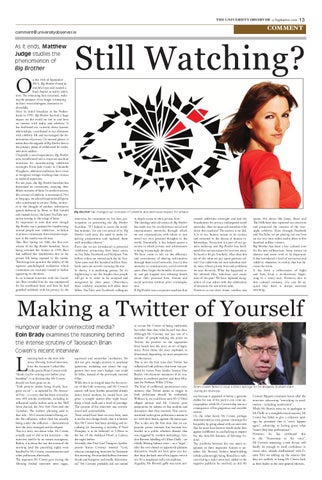 opens. Hit shows like Jersey Shore and The Hills have also captured our attention and promoted the creation of the overnight celebrity. Even through Facebook and YouTube, we are playing out our lives on our very own online reality show to five hundred million viewers. Big Brother has been a key cultural icon for the new millennium. Some mourn its absence and some revel in its departure. It has introduced a level of voyeurism and celebrity obsession in society that has become the norm. It has been a rollercoaster of highs and lows, from a revolutionary beginning to a weary end. However, due to this cultural monster, you can be assured that there is always someone watching.