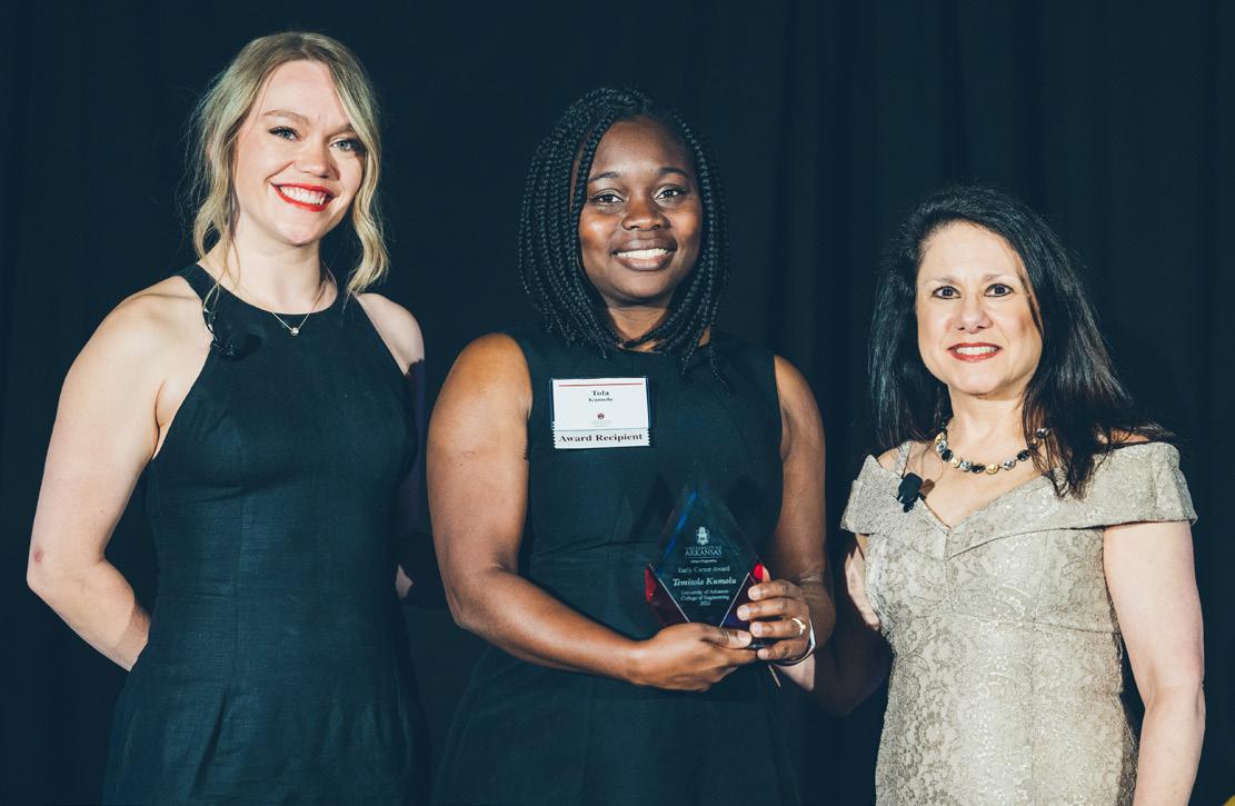 From left: Lauren Kegley chair of the COE Early Career Advisory Board (and ELEG alum), Temitola Okunoren, Dean Kim Needy