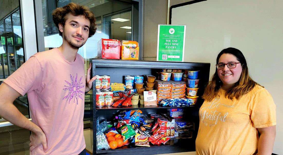 Engineering student group leaders Jeremiah Wimer, left, and Shirley Vega, right, led a project to establish a mini-pantry in Bell Engineering Center 3008.