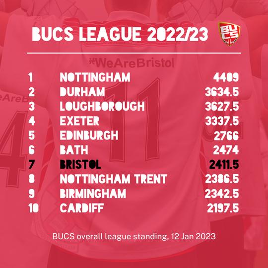 Following a superb summer of planning, which laid the foundations for the season ahead, term 1 of BUCS competition was, by all measures, a success We again entered 90+ competitive teams, in addition to scores of individual athletes, and currently sit 7th in the U.K in the BUCS points league table BUCS points are earned for an institution by the success of its teams.