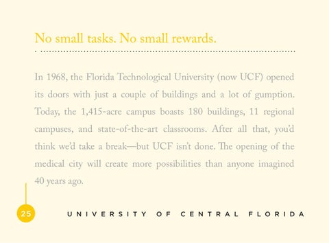No small tasks. No small rewards. In 1968, the Florida Technological University (now UCF) opened its doors with just a couple of buildings and a lot of gumption. Today, the 1,415-acre campus boasts 180 buildings, 11 regional campuses, and state-of-the-art classrooms. After all that, you’d think we’d take a break—but UCF isn’t done. The opening of the medical city will create more possibilities than anyone imagined 40 years ago. 25