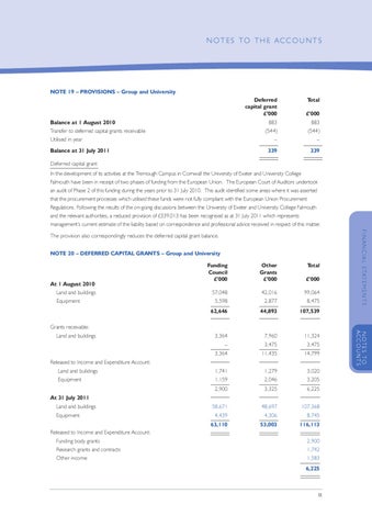 Deferred capital grant In the development of its activities at the Tremough Campus in Cornwall the University of Exeter and University College Falmouth have been in receipt of two phases of funding from the European Union. The European Court of Auditors undertook an audit of Phase 2 of this funding during the years prior to 31 July 2010. This audit identified some areas where it was asserted that the procurement processes which utilised these funds were not fully compliant with the European Union Procurement Regulations. Following the results of the on-going discussions between the University of Exeter and University College Falmouth and the relevant authorities, a reduced provision of £339,013 has been recognised as at 31 July 2011 which represents management’s current estimate of the liability based on correspondence and professional advice received in respect of this matter.