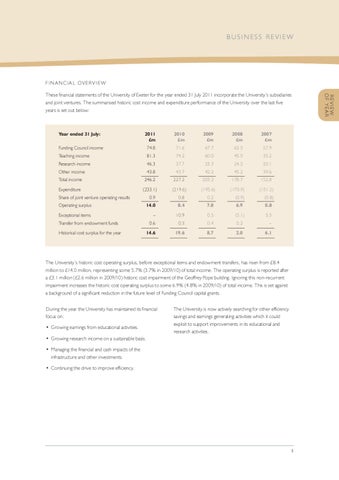 These financial statements of the University of Exeter for the year ended 31 July 2011 incorporate the University’s subsidiaries and joint ventures. The summarised historic cost income and expenditure performance of the University over the last five years is set out below: