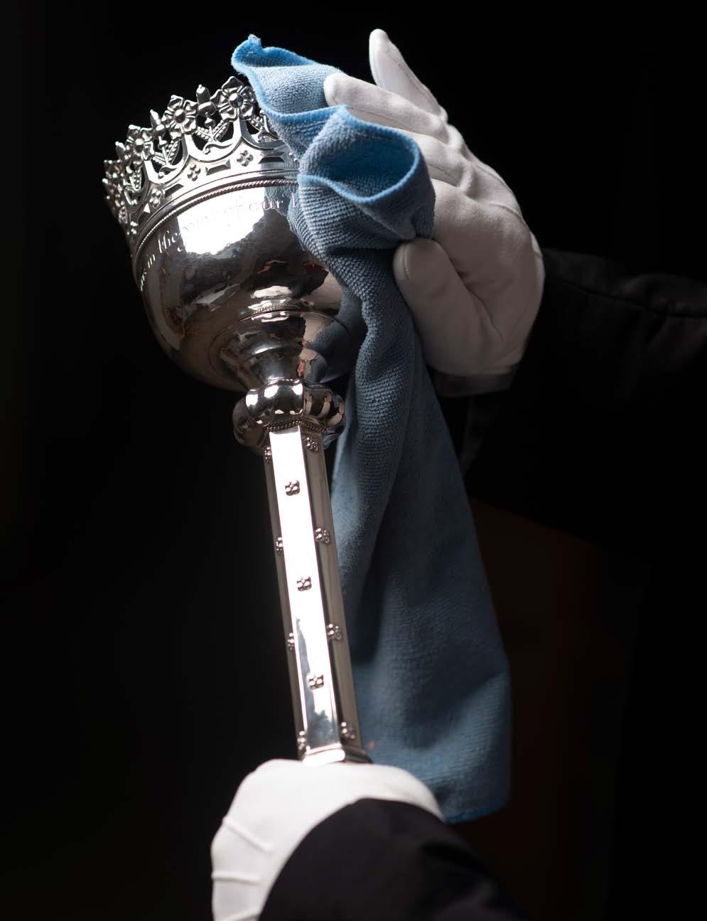 The Mace was presented to the University in 1933 by University architect Emanuel Vincent Harris. It is approximately four feet long with a solid silver shaft and head. The finial at the top contains a representation in enamel of the University’s coat of arms. This symbolises the historical associations of the University with the locality. The triangular gold castle with three towers comes from Exeter’s coat of arms and is thought to represent the Rougemont Castle as alluded to by the red background. The 15 gold bezants around the edge of the shield are from Cornwall’s coat of arms, whilst the green cross on a white background is from Devon County Council’s coat of arms. The theme of learning is symbolised by the book with gold edges and a Latin inscription translating roughly as “We follow the light”.